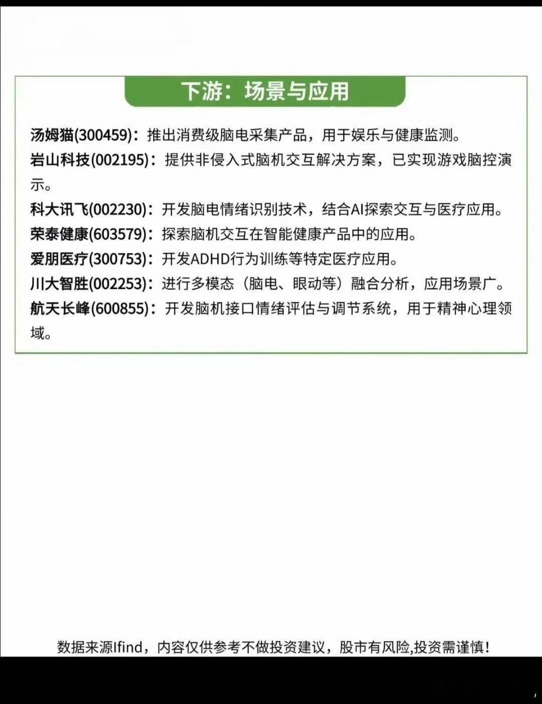 脑机接口:龙头股 整理!脑机接口有望接棒商业航天,成为1月份炒作主线,后续看持续性如何。1.上游:核心硬件与基础设施2.中游:设备与系统集成3.下游:场景与应用