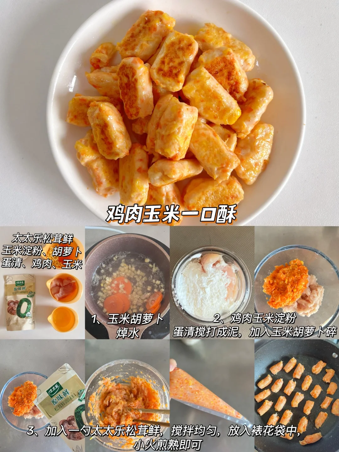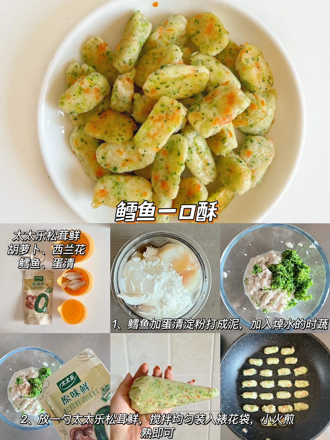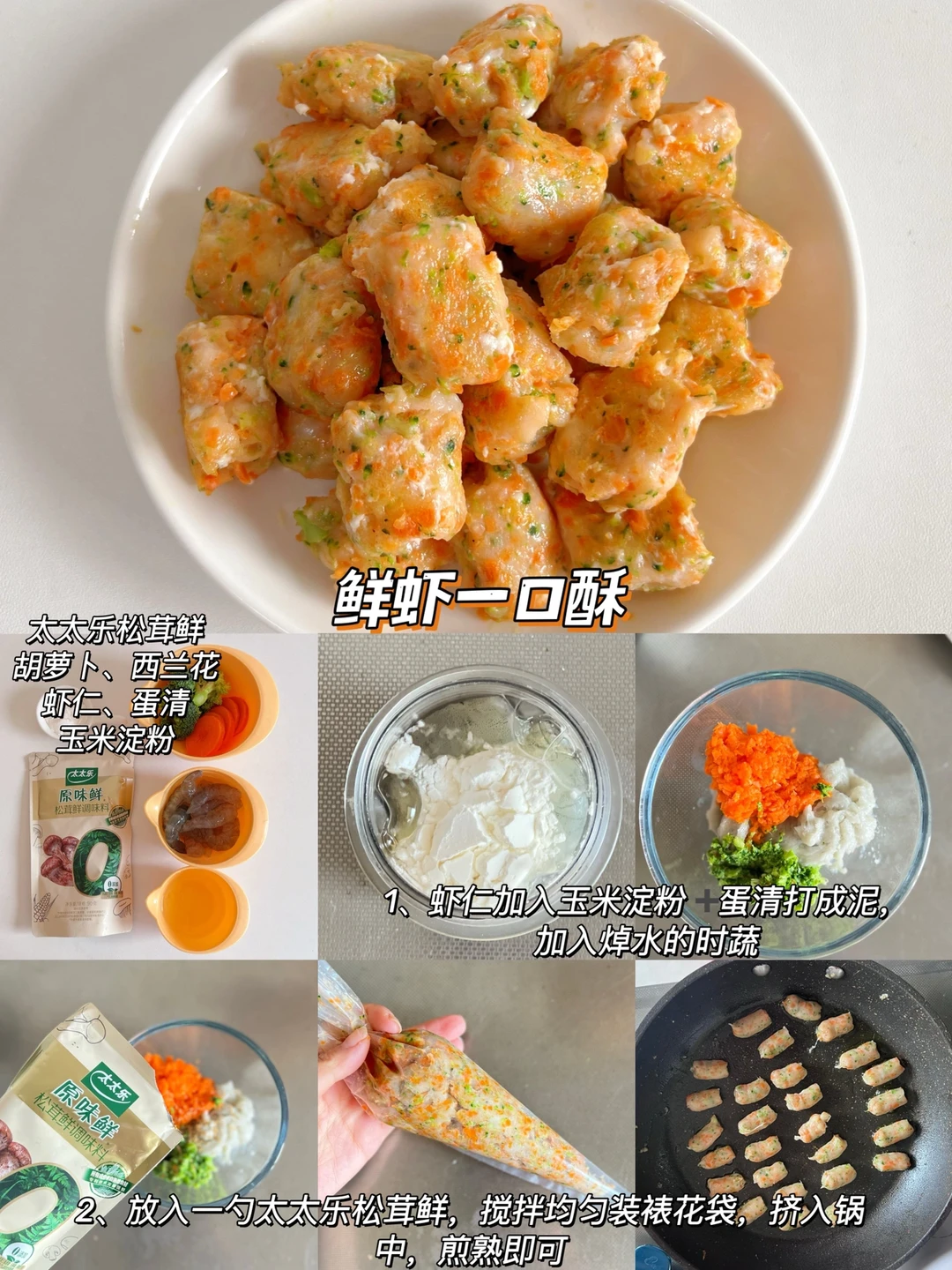 🔸鲜虾一口酥 食材:西兰花、胡萝卜、蛋清 个、鲜虾仁100克、淀粉 10克 🔸鸡肉玉米一口酥 食材:鸡肉100克、淀粉15克、蛋清1个,胡萝卜、玉米 🔸山药猪肉一口酥 食材:猪肉100克、淀粉10克、山药50克、蛋清1个、青菜 🔸牛肉一口酥 食材:牛肉100g克、淀粉10克、士豆洋葱适量 🔸鳕鱼一口酥 食材:鳕鱼 80克、淀粉 20克、蛋清1 个,山药20克、西兰花适量 🔸鸡肉时蔬一口酥 食材:鸡肉100克淀粉 15克、蛋清1个,胡萝卜、西兰花 一口一个,而且有菜有肉,月亮每次都很爱吃,做的大小根据宝宝大小哈~ 宝宝长大之后对辅食的味道也有了要求,调味品的话我选择的是这款太太乐松茸鲜,不仅甄选云南本地的野生松茸,而且搭配了其他多种菌菇,菌菇鲜味醇厚,我们家宝宝每次都可以光盘~ 当然对于宝宝来说,吃得健康肯定是更重要的,太太乐出品的这个松茸鲜,配料表简洁0添加,用到的盐也是矿物盐,就不需要额外加盐了。太太乐是我们家做饭经常用到的经典品牌了,这款太太乐松茸鲜还是自有工厂生产,我用着很放心,所以松茸鲜,我选太太乐~ 马上就是双十一了,妈妈们可以屯一点太太乐松茸鲜试试,正好可以凑个单~日常做饭像我一样加一勺太太乐松茸鲜,轻松拿捏饭渣宝宝~