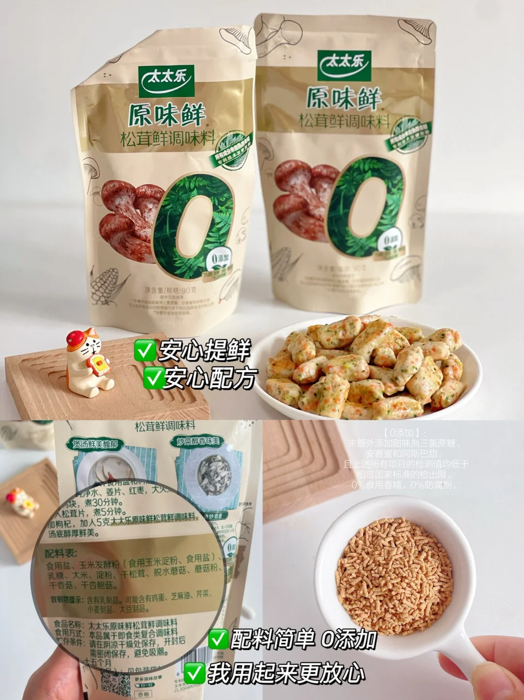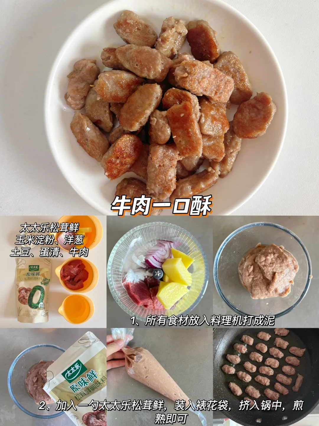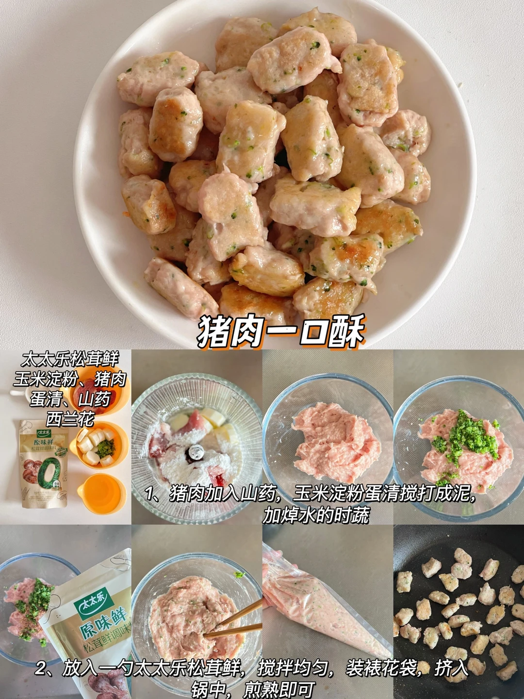 🔸鲜虾一口酥 食材:西兰花、胡萝卜、蛋清 个、鲜虾仁100克、淀粉 10克 🔸鸡肉玉米一口酥 食材:鸡肉100克、淀粉15克、蛋清1个,胡萝卜、玉米 🔸山药猪肉一口酥 食材:猪肉100克、淀粉10克、山药50克、蛋清1个、青菜 🔸牛肉一口酥 食材:牛肉100g克、淀粉10克、士豆洋葱适量 🔸鳕鱼一口酥 食材:鳕鱼 80克、淀粉 20克、蛋清1 个,山药20克、西兰花适量 🔸鸡肉时蔬一口酥 食材:鸡肉100克淀粉 15克、蛋清1个,胡萝卜、西兰花 一口一个,而且有菜有肉,月亮每次都很爱吃,做的大小根据宝宝大小哈~ 宝宝长大之后对辅食的味道也有了要求,调味品的话我选择的是这款太太乐松茸鲜,不仅甄选云南本地的野生松茸,而且搭配了其他多种菌菇,菌菇鲜味醇厚,我们家宝宝每次都可以光盘~ 当然对于宝宝来说,吃得健康肯定是更重要的,太太乐出品的这个松茸鲜,配料表简洁0添加,用到的盐也是矿物盐,就不需要额外加盐了。太太乐是我们家做饭经常用到的经典品牌了,这款太太乐松茸鲜还是自有工厂生产,我用着很放心,所以松茸鲜,我选太太乐~ 马上就是双十一了,妈妈们可以屯一点太太乐松茸鲜试试,正好可以凑个单~日常做饭像我一样加一勺太太乐松茸鲜,轻松拿捏饭渣宝宝~