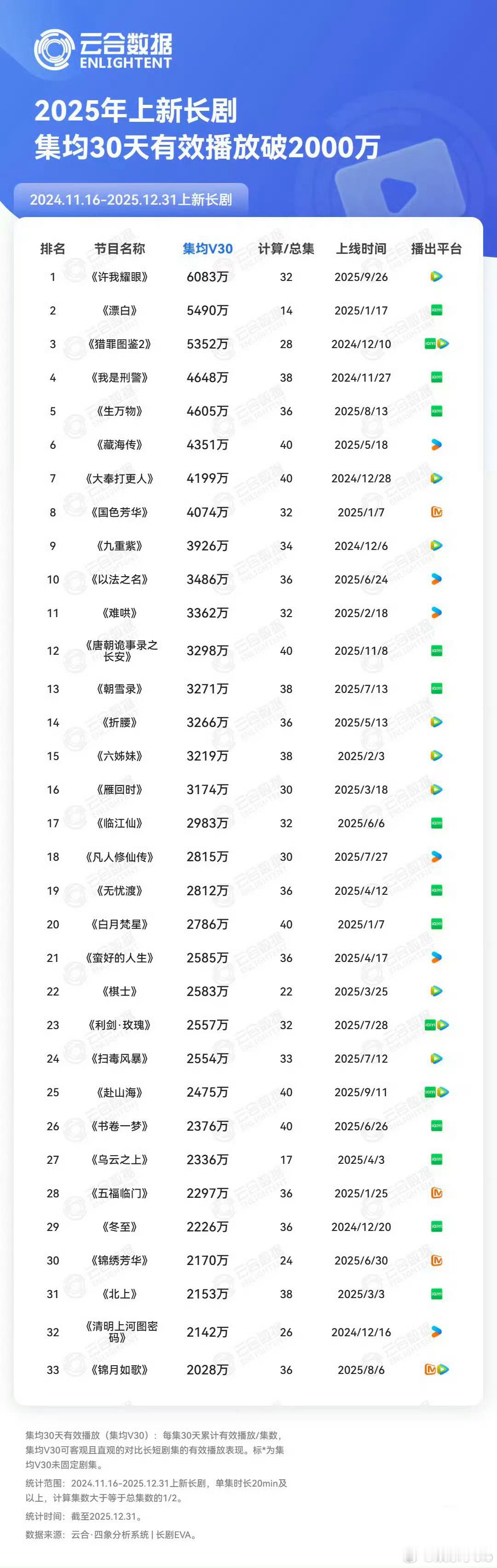 2025年上新长剧云合年榜集均V30有效播放:《许我耀眼》《漂白》《猎罪图鉴2》《我是刑警》《生万物》《藏海传》《大奉打更人》等热播期集均有效播放:《许我耀眼》《漂白》《生万物》《大奉打更人》《藏海传》《国色芳华》《唐诡3》等累计有效播总量:《藏海传》《大奉打更人》《许我耀眼》《生万物》《白月梵星》《国色芳华》《折腰》等