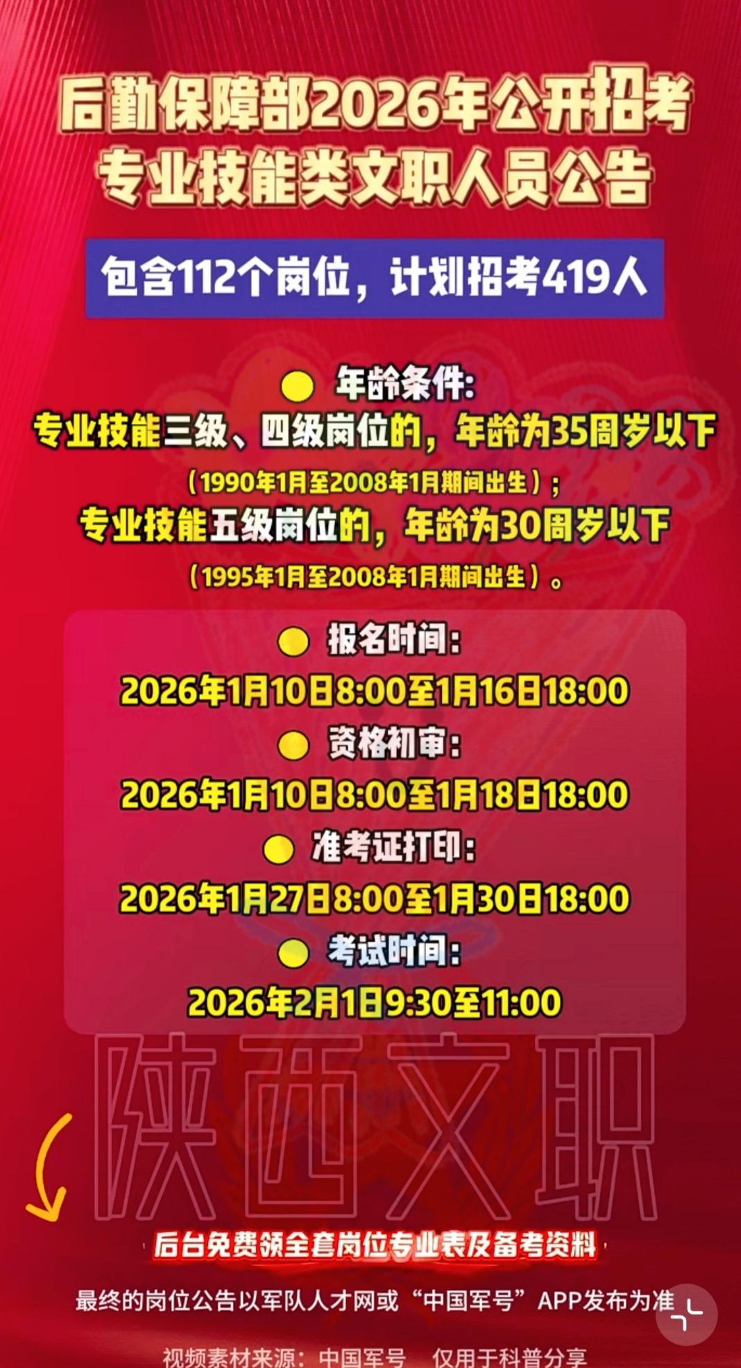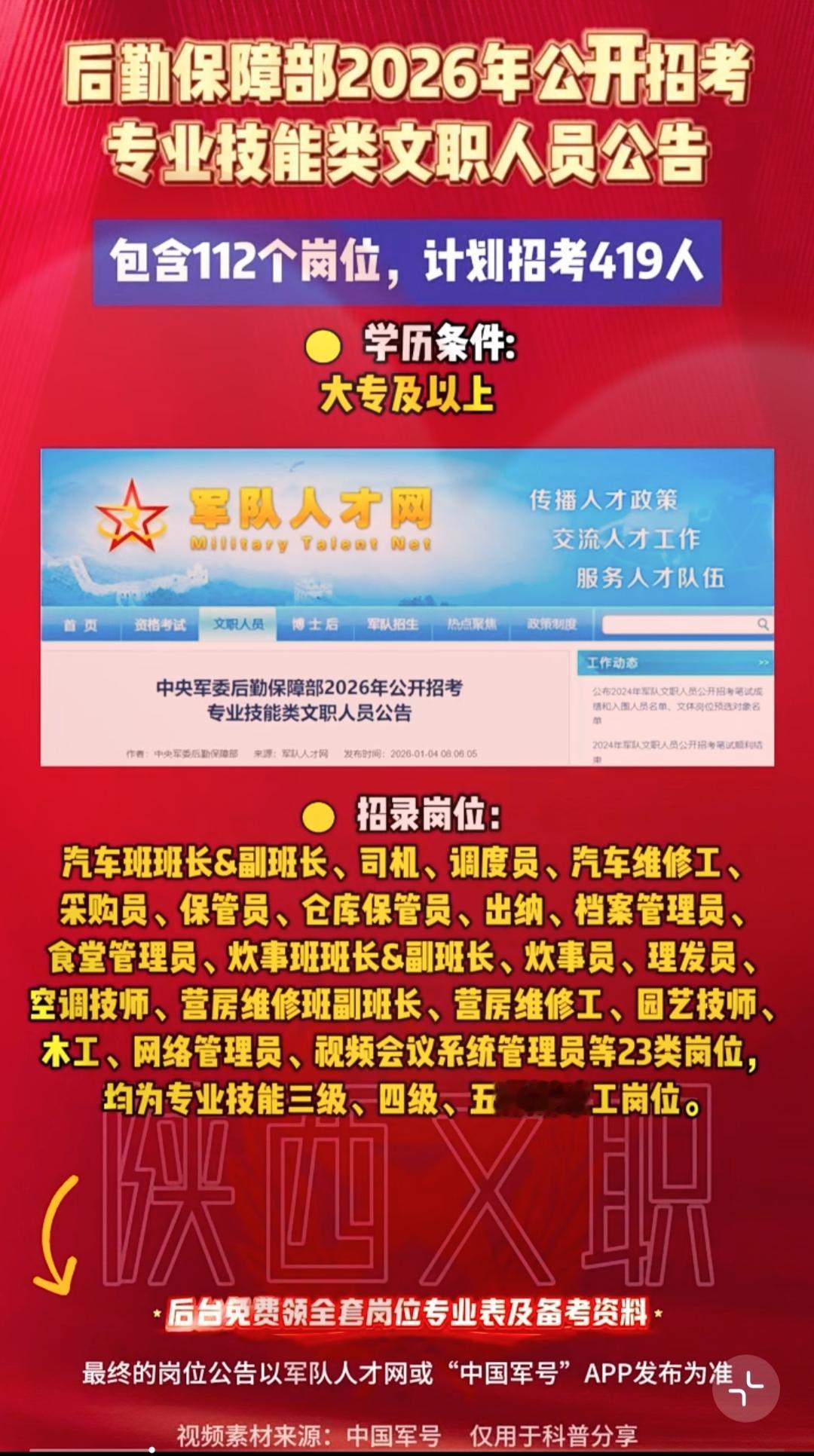 快讯快讯! 中央军委后勤保障部这次算是放了个大招,2026年的招考直接面向社会铺开了。 仔细看那些岗位,驾驶、维修、甚至连炊事班都在招人,这就是要搞彻底的“专业化”。 这下咱们手里有技术证的师傅们可算是不仅有了面子,还能端上个稳当饭碗。 但这时间表排得是真够呛,1月10号就要报名,2月1号直接笔试,连个喘息机会都不给。 说到底,人家这就是要的一批能“即插即用”的熟练工,谁也没工夫等你慢慢适应。 对于想求稳的司机、修车师傅来说,这诱惑力绝对比外面的私企强太多。 不过门槛也是硬碰硬,35岁的年龄线卡在那,社保流水还得严查,想蒙混过关根本没戏。 特别是退役军人还有优待加分,这名额怕是要抢破头了。