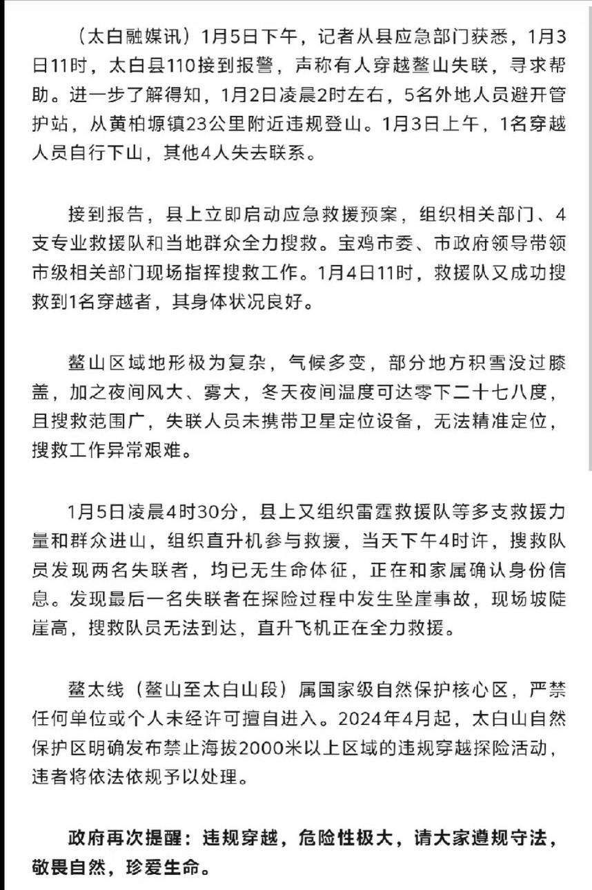 噩耗传来!元旦期间私闯鳌太线的五人团队,最后失联的三人已确认:两人遇难,一人坠落崖下,因环境险峻暂无法转移。 2026年的春节,这几个家庭注定要在失去至亲的悲痛中度过了。 他们原计划只是一次“速穿”:晚上出发,第二天回家。可大自然从来不给侥幸留余地。 一位曾三次冬季尝试同路线的驴友后怕地说:“走过三次,一次因大雪撤了。体能或许够,但天气突变太快,准备不足真的会要命。” 时间线沉痛而清晰: 1号晚10点多,5人进入鳌太区域; 2号凌晨2点多,从黄柏塬附近登山; 3号,一人因身体不适下撤,其余4人失联; 4号中午,救援队在采药人窝棚找到一名脚部冻伤的男子; 5号下午,发现两人已无生命体征; 最后一人坠在崖下,暂时无法运回。 明明知道危险,为什么还要冒险? 有人说该立块牌子:“禁止穿越,私自闯入后果自负,概不救援”;也有人建议实时更新遇难人数,“数字最能惊醒梦中人”。甚至还有人提议把鳌太线修成景观大道、设补给站,让挑战变安全。 可山就在那里,它从不为谁改变。自然不需要征服,它只需要敬畏。 政府一再警告,媒体反复报道,仍有人选择在最冷的月份登山。这不是勇气,是侥幸;不是探险,是赌命。 没有专业能力,偏要做专业的事;用一腔热血去对抗气候、地形与体能极限,赢了的没有奖杯,输了的却可能再无归途。 愿逝者安息,更愿生者清醒。 真正的户外精神,是准备充分、量力而行。