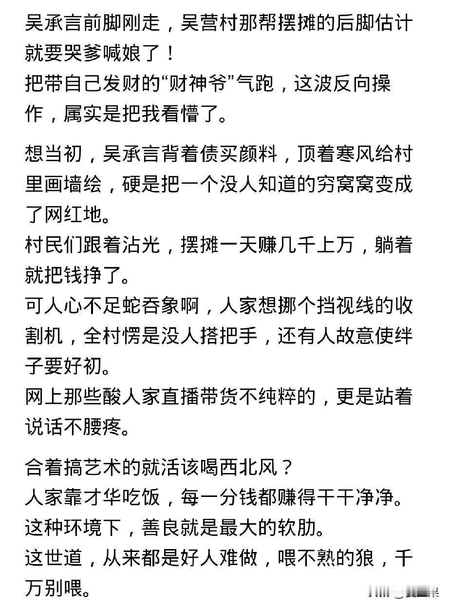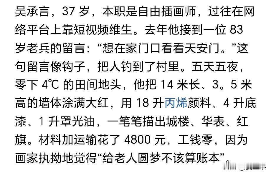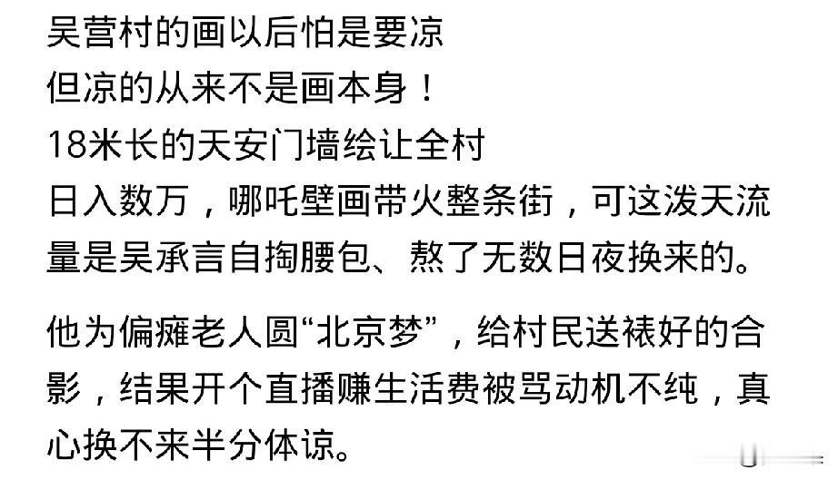 吴承言, 一位六考美院都没有上榜的画师, 却以自己的绘画力量,再次激发基层老百姓对祖国的热爱, 这种不忘初心有着朴实大爱的人让人赞叹, 我们应该支持他。就算他开直播赚流量也是应当的。