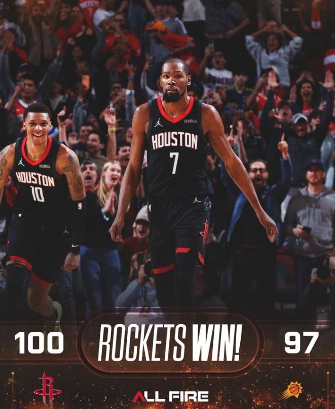 火箭队今天100:97主场险胜太阳队。本场比赛,火箭队杜兰特表现出色,他不仅砍下了26分,还绝杀了对手。火箭队赛后也制作了赢球海报,杜兰特自然是其中的核心人物。而本场比赛同样表现不错的小贾巴里·史密斯则成为了杜兰特的陪衬,他们两人登上了这次的赢球海报。本场比赛杜兰特绝杀对手,全场贡献了26+10+4的数据。小史密斯本场比赛表现也有所回暖,11投6中,三分8中3,全场贡献了17+7+3的数据。下半场,他更是三分球5投3中,贡献了14分。如果单凭杜兰特,不一定能够战胜对手,而小史密斯成为了本场比赛杜兰特的左膀右臂,他用一记又一记的三分和稳定的中投,去打击着太阳队的士气,最终才有了火箭队绝地反击,杜兰特最后几秒三分球绝杀太阳队的表现。就算申京缺阵,火箭队的小史密斯和杜兰特两位锋线的首发,依旧能带领火箭队拿下胜利。