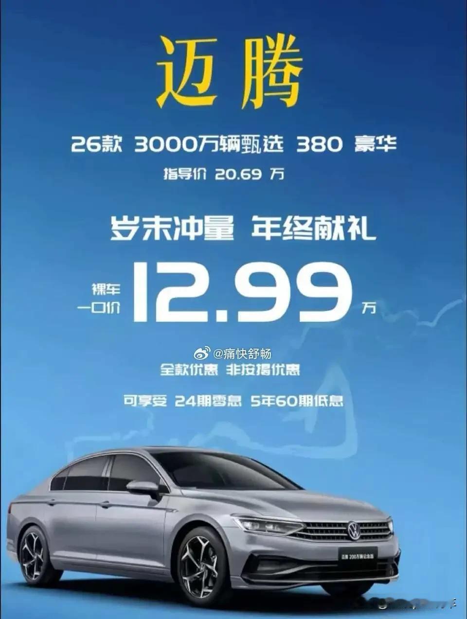 大众或许还撑得住,但这就是赤裸裸的现实。 2010年,迈腾在我国卖了:78859辆。 2015年,迈腾在我国卖了:168814辆 。 2020年,迈腾在我国卖了:163031辆 。 2021年,迈腾在我国卖了:151325辆 。 2022年,迈腾在我国卖了:160007辆 。 2023年,迈腾在我国卖了:177212辆 。 2024年,迈腾在我国卖了:178943辆 。2025年1-11月,迈腾在我国卖了:183217辆 。 12万开德系B级车?迈腾降价不跌面,2025年还能卖19万+台 谁能想到,当年妥妥的合资中型车标杆迈腾,如今终端价已经下探到12万左右起步。这个价格放在几年前,连高配紧凑型车都难拿下,现在却能开走一台正宗德系B级车,难怪不少务实车主都说“这波不亏”。 2007年迈腾正式国产化,那时候的大众凭着扎实的德系品质和亮眼的底盘操控,在国内市场口碑一路看涨。入门版19.28万的指导价,在当年可不是小数目,但丝毫不影响它成为很多家庭和商务人士的首选。一路稳扎稳打下来,2018年迎来销量巅峰,一年卖出22万多台,妥妥的中型车市场“顶流”。 后来国产新能源崛起,车市价格战打得越来越激烈,韩系、美系、法系中型车纷纷陷入低迷。原本十七八万起步的迈腾,也不得不加入价格调整的队伍,现在部分地区入门版不到13万就能入手,比不少国产紧凑型新能源还实惠。但和其他品牌不同的是,迈腾没出现断崖式下滑,反而靠着多年积累的品牌底蕴和产品口碑,成了合资燃油车的“抗跌标杆”。 这份“抗跌”不是凭空来的。作为德系车的代表,迈腾的底盘调校一直是加分项,前麦弗逊+后多连杆的悬挂组合,高速行驶稳当,过弯时侧倾控制得不错,开着让人心里有底。2871mm的轴距带来宽敞后排空间,日常家用或偶尔商务接待都够用,533L的后备箱也能满足长途出行的装载需求。主力车型搭载的1.5T和2.0T发动机,匹配7速双离合变速箱,动力输出平顺,日常通勤油耗也在可接受范围。 2024年,迈腾卖出了近17.9万台,2025年前11个月销量就突破18.3万台,预计全年能超过19.5万台,稳稳实现同比增长。在新能源渗透率逼近60%的当下,能保持这样的成绩实属不易,和帕萨特、凯美瑞一起守住了合资燃油车的阵地。 对很多务实消费者来说,迈腾的吸引力很直接:花紧凑型车的钱,买B级车的空间和品质,维修保养方便,三年保值率也还算可观。虽然在智能化配置上,它比不过新能源新车,但扎实的机械素质、成熟的动力总成,依然戳中了不少人的需求。 从当年的高端标杆到如今的性价比之选,迈腾的价格变了,但核心优势没丢。在车市迭代加速的今天,这样一台“降价不跌面”的合资B级车,或许正是很多人想要的务实之选。你觉得现在12万左右入手迈腾,划算吗?