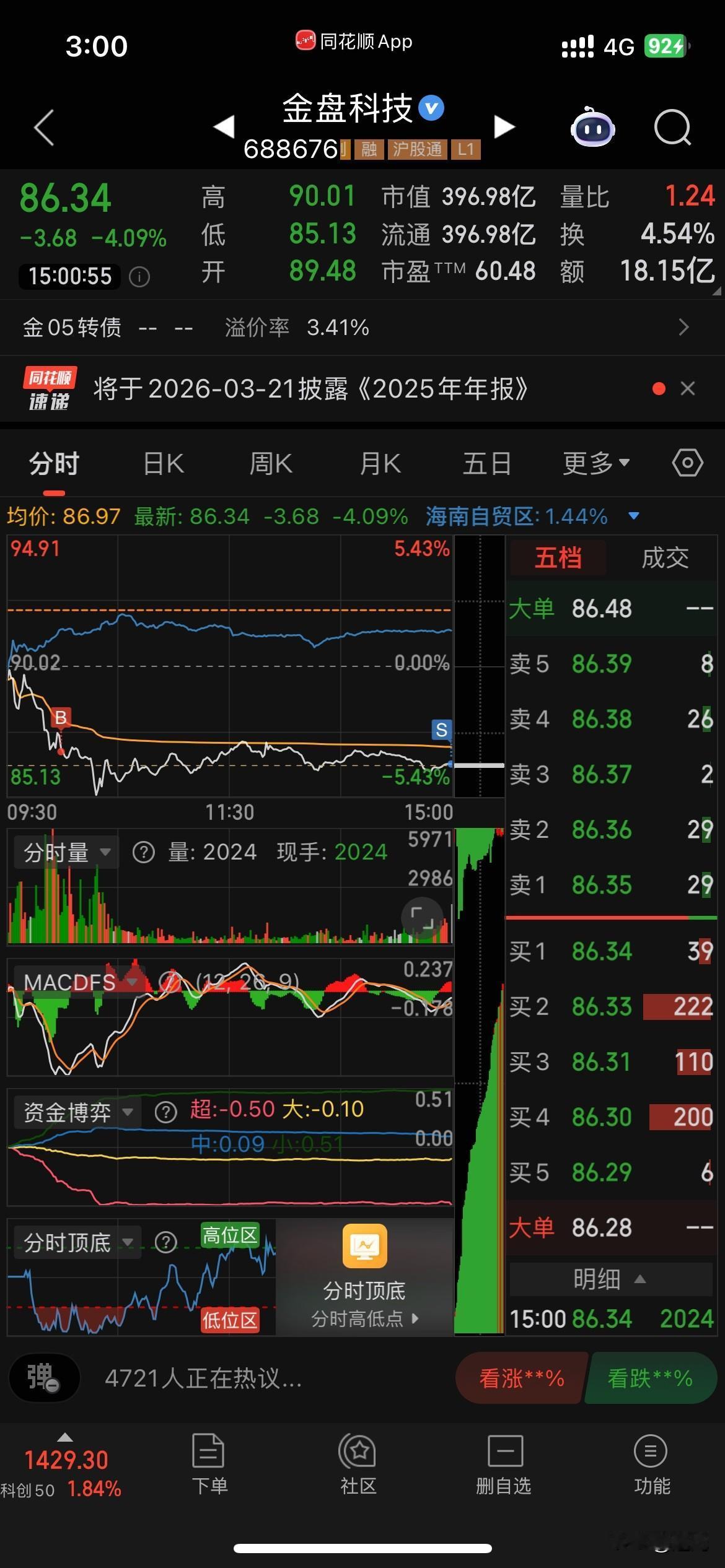 大盘下午还是很强,完全不给空头机会。我今天好像是个旁观者,手里的票2跌2红。红的也是小涨,好不爽啊。收盘跟上午差不多红了2百多。由于大盘连续大涨,有点担心。尾盘把今天加仓的金盘卖出去了。这样明天金盘再跌还可以低点再加仓降低成本且保持总仓位不变。