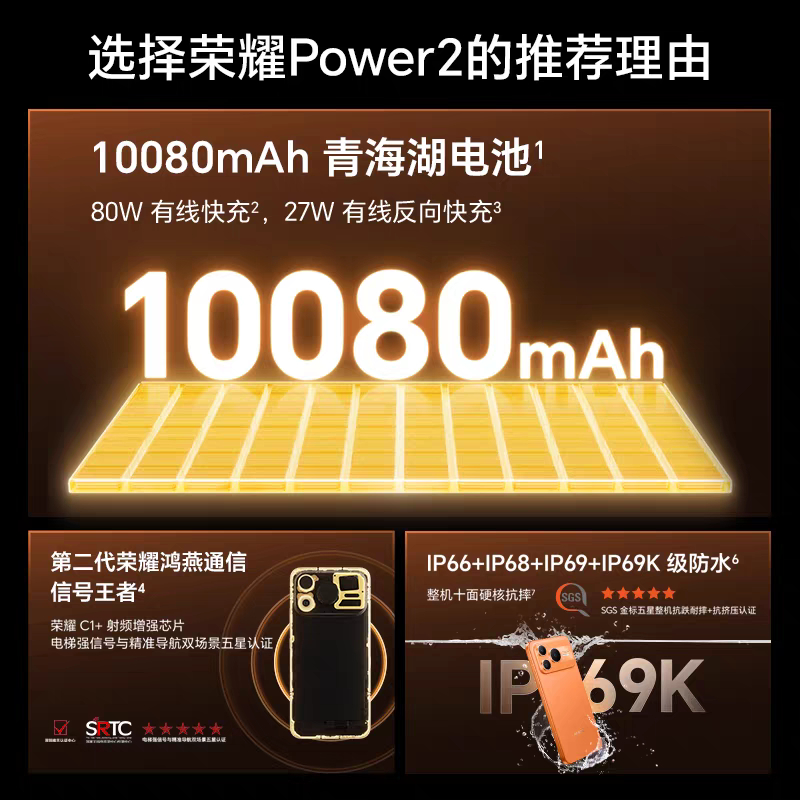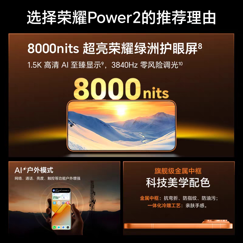 数码闲聊站 荣耀Power2正式发布,2699元起!1.处理器:天玑8500 Elite+LPDDR5X+UFS4.1 !2.屏幕:6.79寸1.5K OLED居中打孔直屏,120Hz刷新率,3840Hz PWM高频调光!3.影像:前置1600w,后置5000w主摄+500w超广角!4.续航:10080mAh+80w有线+27w有线反向充电!5.其他:MagicOS 10,荣耀C1+射频增强芯片,太极缓震架构2.0,红外、NFC、立体声双扬声器,IP66/68/69/69K防尘防水,旭日橙、雪原白、幻夜黑三色,12+256GB 2699元起!