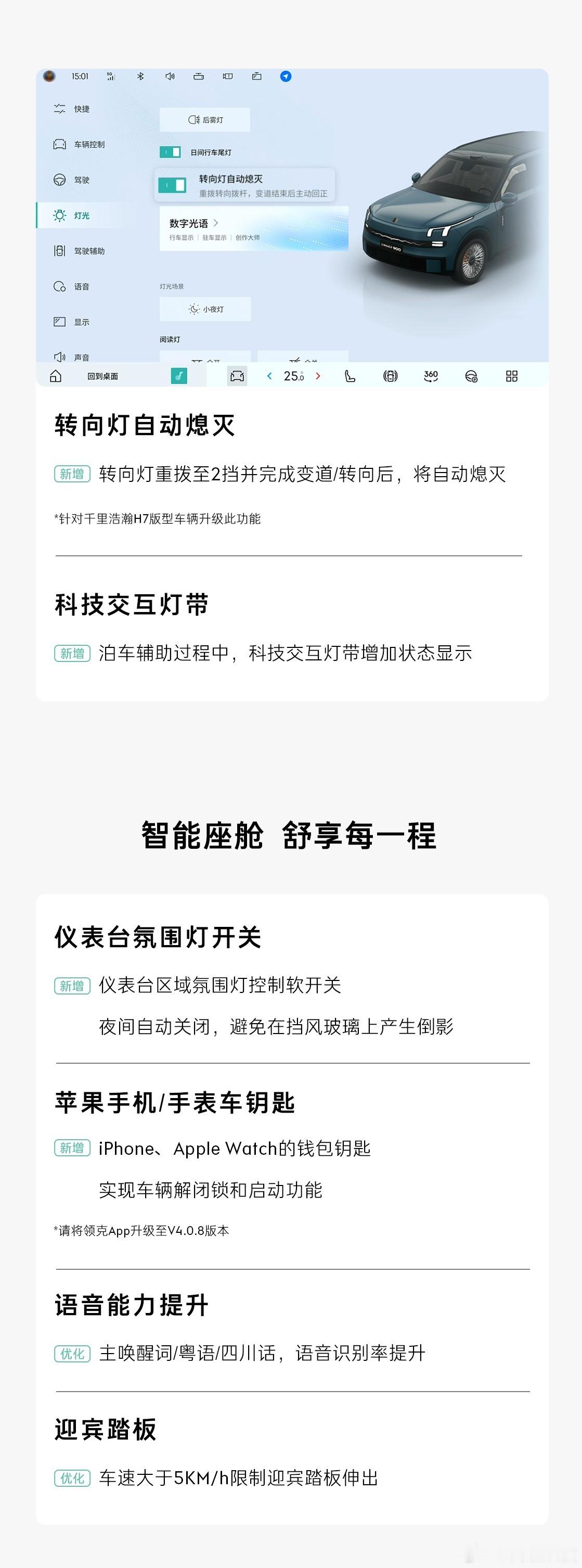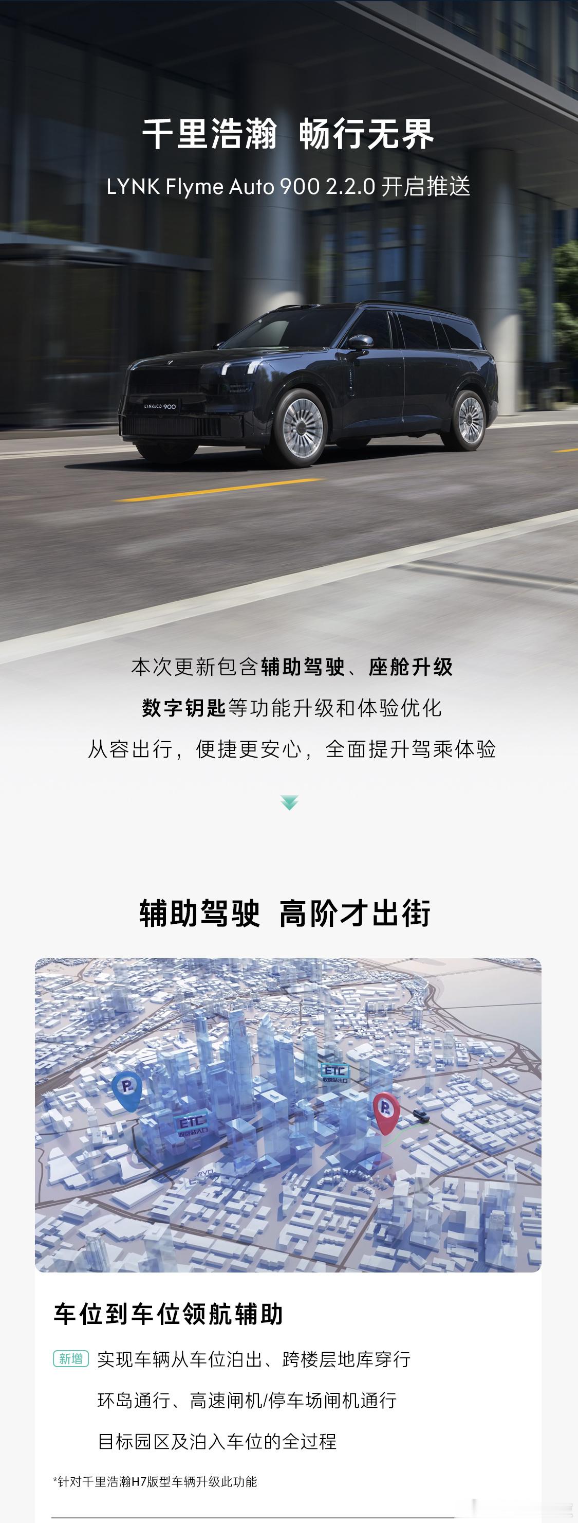 领克900推送端到端辅助驾驶OTA 领克900开启OTA升级推送:LYNK Flyme Auto 900 2.2.0。本次OTA升级针对领克900千里浩瀚H7版本,核心功能是D2D车位到车位、领航驾驶辅助等。