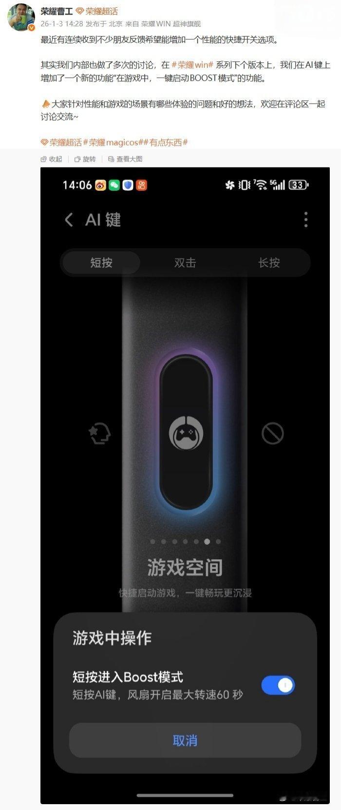 【荣耀工程师详解 WIN 系列手机「极速启动」功能:自研多线程着色器编译技术,比竞品快约一倍】荣耀游戏研发工程师 冯同学发文详细介绍了 WIN 系列手机的「极速启动」功能:1. 用户场景:当《原神》《绝区零》版本更新后,需要经历一段着色器编译等待才能进入游戏内,迫切要游戏的心情被长时间等待影响。极速启动可以在游戏版本更新后减少进入等待的时间,快速进入游戏。2. 功能收益:原神启动时间,荣耀 WIN 领先友商 15A 52%;绝区零启动时间,荣耀 WIN 领先友商 15A 233%,功能是默认生效的,无需手动打开。3. 技术原理:荣耀自研的多线程着色器编译技术,基于最新的芯片架构进行优化,匹配更高效的着色器编译效率,基于任务负载重排优先级,实现比竞品启动快约一倍的效果。内部进行了多次讨论,最终决定在 WIN 系列的下个版本中,为 AI 键新增“游戏中一键启动 BOOST 模式”功能。这项功能可以在游戏中短按 AI 键开启,打开后机身风扇会开启最大转速并持续 60 秒,进一步降低机身温度。荣耀 WIN / WIN RT 手机已于 12 月 26 日下午正式发布,分别搭载第五代骁龙 8 至尊版和骁龙 8 至尊版处理器,并全系内置 10000mAh 巨无霸青海湖电池,定价 3999 元 / 2599 元起。