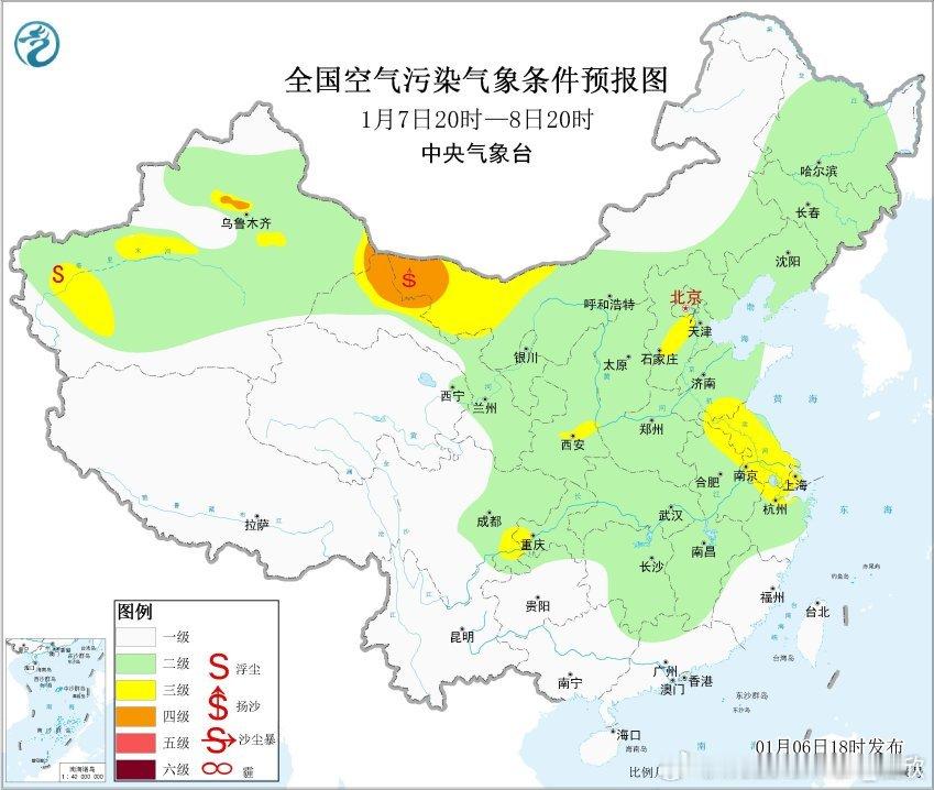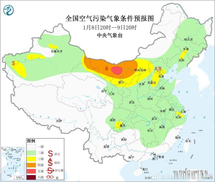 【霾和沙尘】今天白天在偏西风推动下,霾向东传输,上海今天下午也一度出现了重污染。今晚到明天,华东一带有西北风,霾有望进一步减弱东传。另外8日-9日,内蒙古西部一带风较大,有可能激发出沙尘。