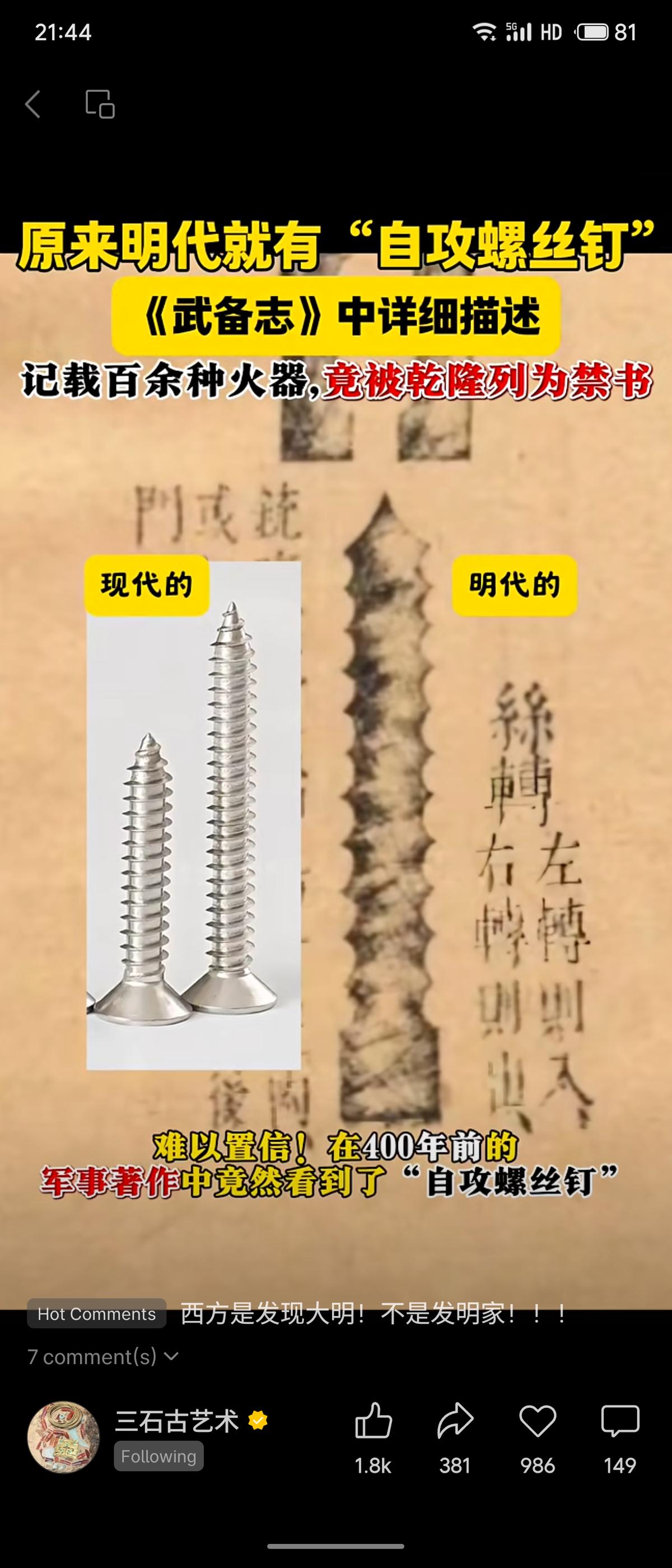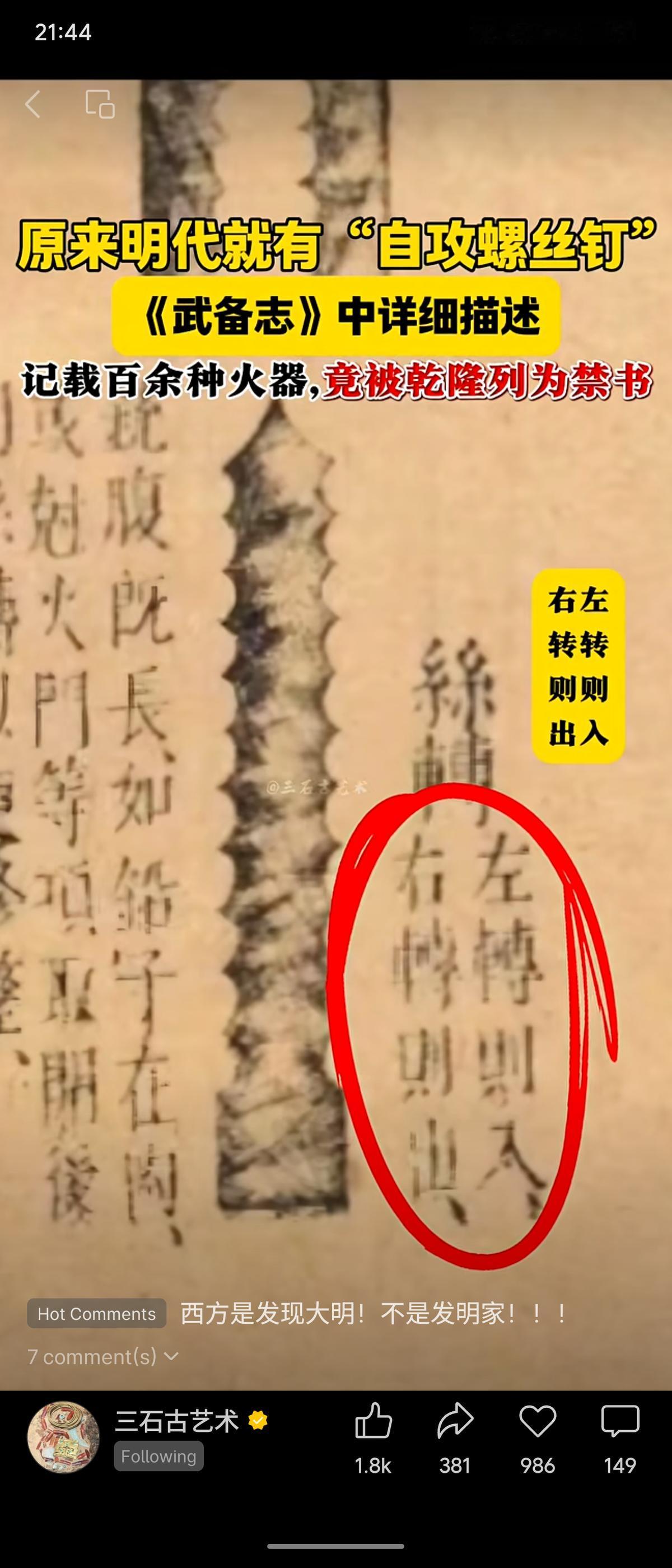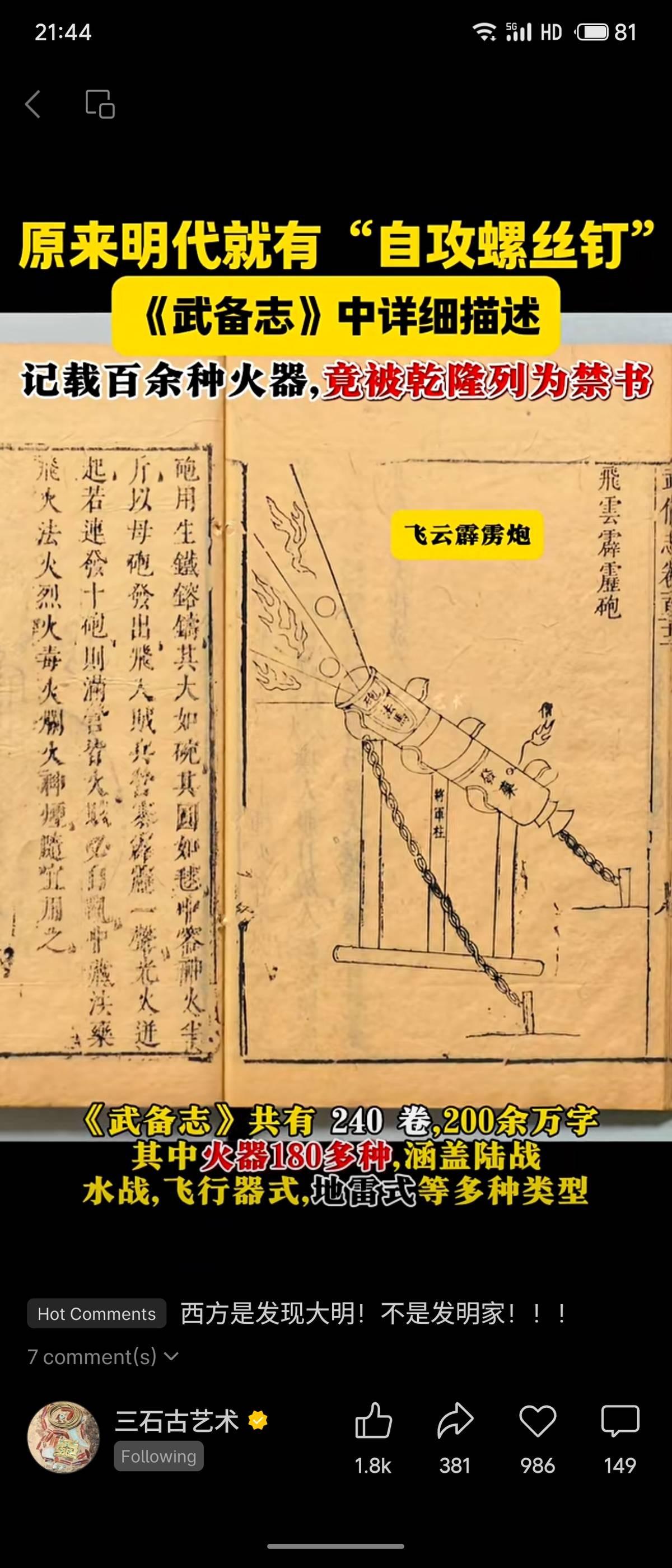 《武备志》里画着自攻螺丝钉和上百种火器。 然后乾隆把它禁了。 那种感觉,就像你家