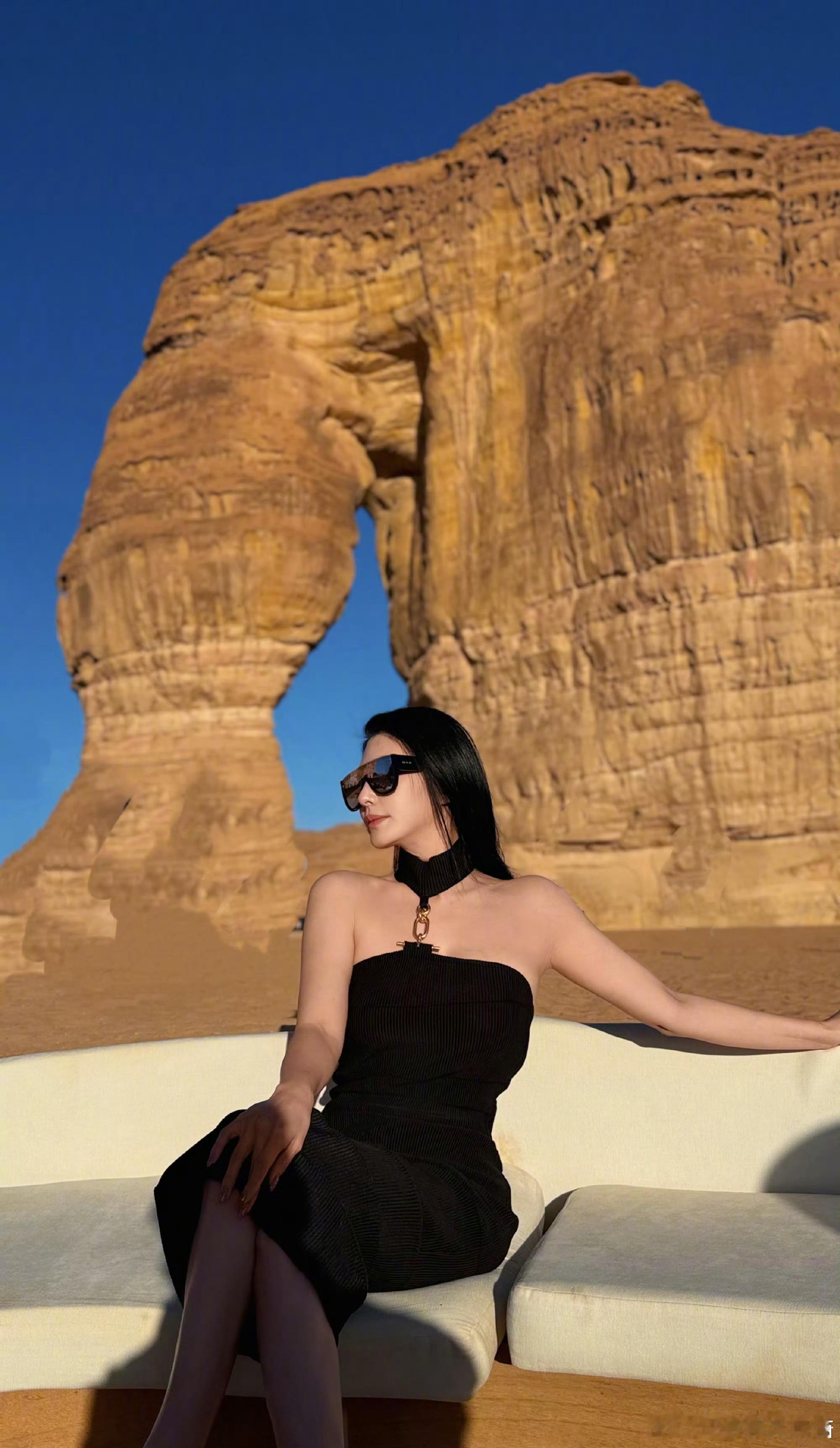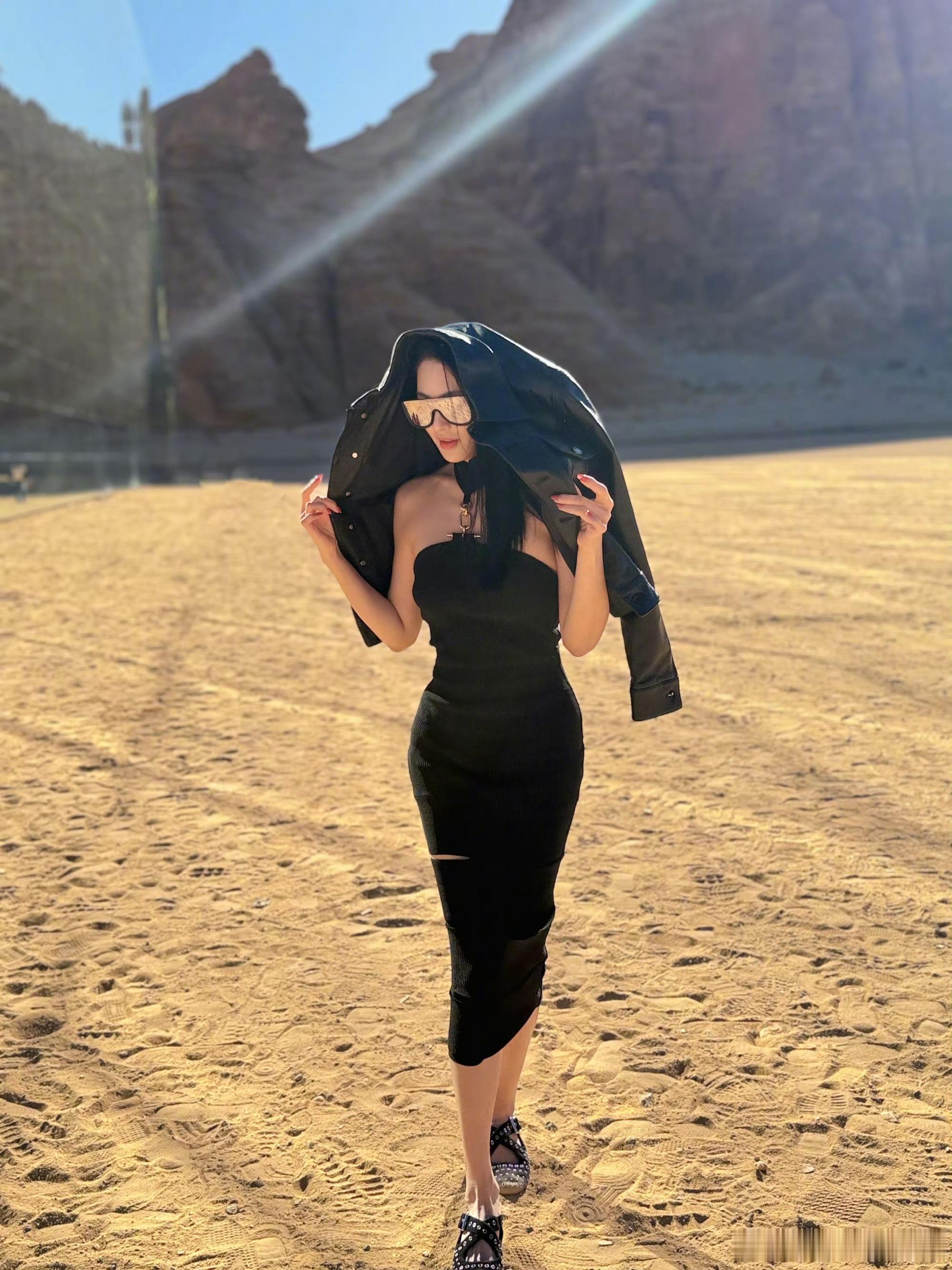 张雨绮把沙漠当秀场走 张雨绮的气场hold住一切,黑裙配黑皮衣,走在沙漠里也让人幻视秀场,轻轻松松就出片!!