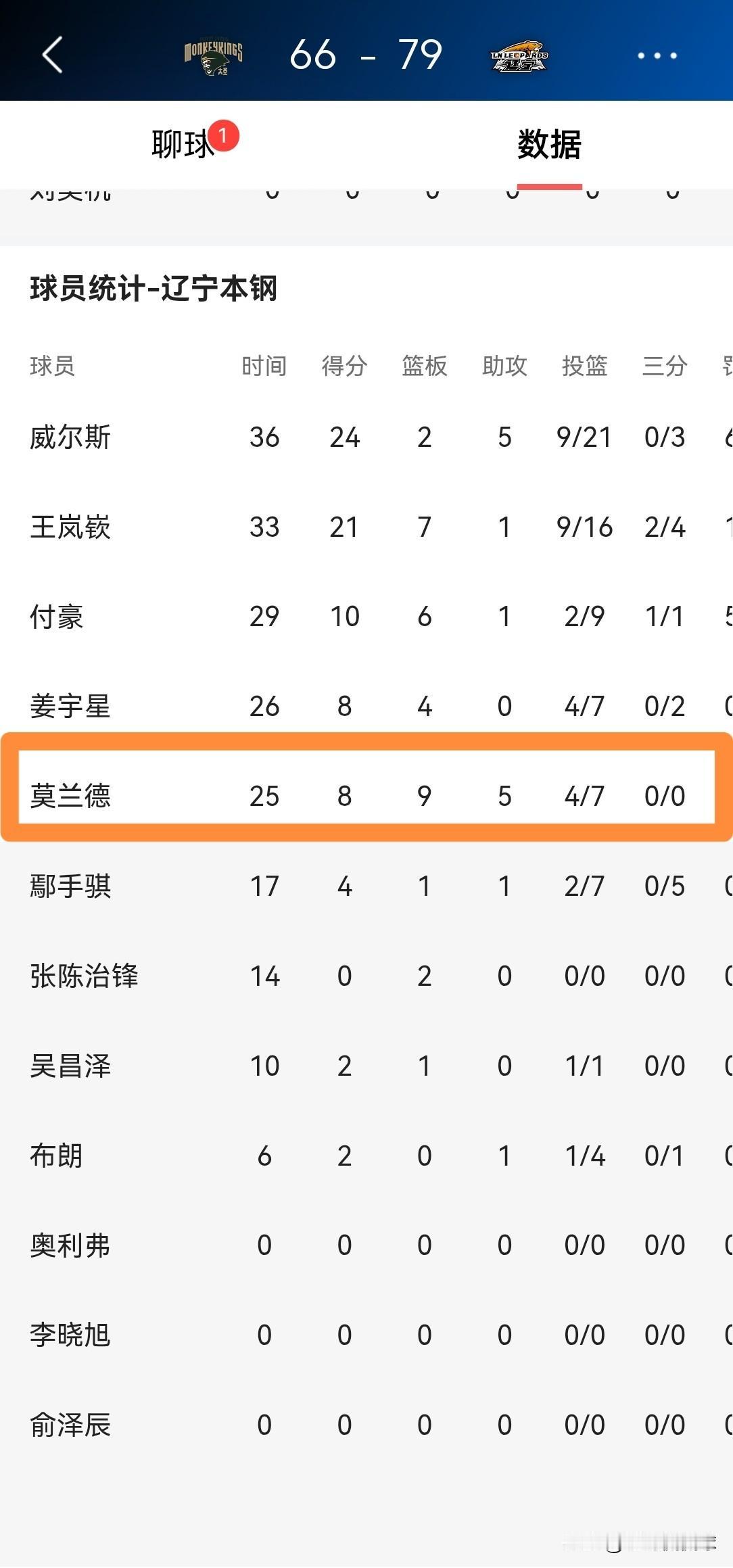 辽宁本钢老将莫兰德又躺赢了一场!在今天辽宁本钢客场以79:66战胜南京天之蓝的比赛中,莫兰德首发出战25分钟,投篮7中4轻松砍下8分9篮板5助攻1抢断1盖帽。 事实证明,当莫兰德的上场时间低于30分钟时,他的进攻效率还是非常高的,一旦莫兰德的上场时间过长,他就会因为体力不支而表现糟糕,随之而来的就是球队的输球。