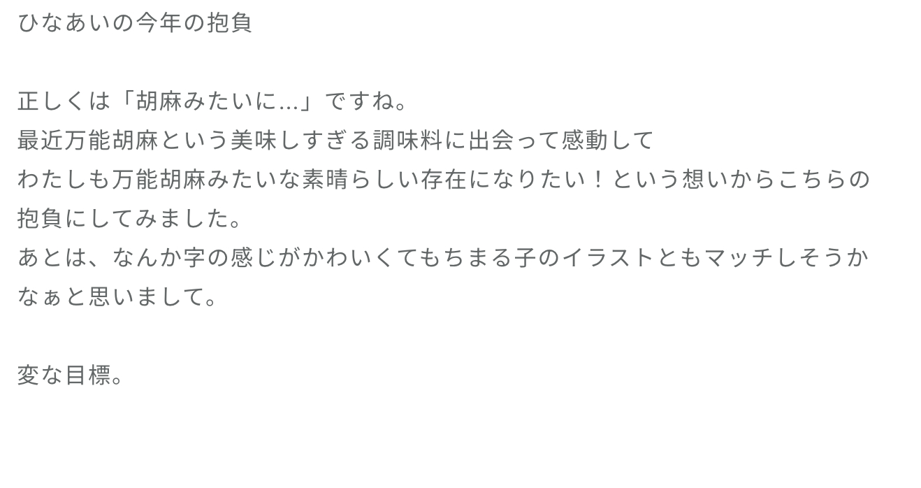 ひなの「ひなあいの新年企画、何気にアイドル人生初めてのどうぶつマスクでした。マスクの中ってこうなってるんだ〜って新鮮だったよ。マチさんという馬になって、「マチの待ち合わせ」という名言を残すことに成功して大満足でしたが予想の時にはなぜだかメンバーみんなに正体がバレていてびっくりしました。あまり私っぽさを出さないように気をつけたつもりだったのになんでだろう。」