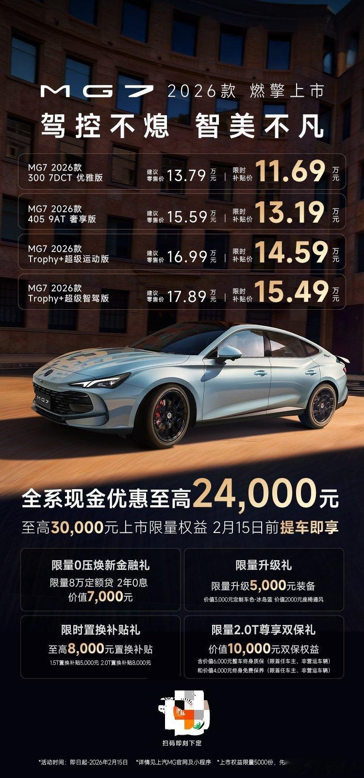 MG7 2026款限时补贴价11.69万元起,全系标配大家看图,分量挺足!MG7