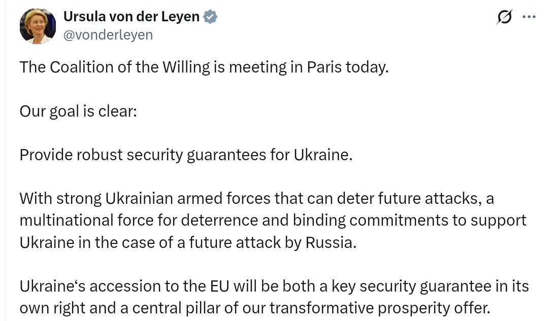 冯德莱恩:“自愿联盟”今天在巴黎举行会议。 我们的目标很明确: 为乌克兰提供强有力的安全保障。 乌克兰拥有强大的武装力量,可以威慑未来的袭击;乌克兰还组建了一支多国部队进行威慑;并且乌克兰做出了具有约束力的承诺,在俄罗斯未来发动袭击时支持乌克兰。 乌克兰加入欧盟本身既是一项重要的安全保障,也是我们变革性繁荣计划的核心支柱。