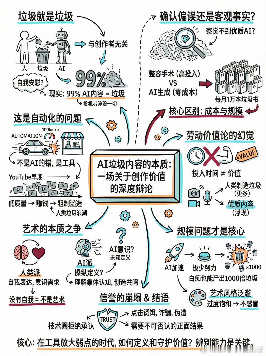 【AI垃圾内容的本质:一场关于创作价值的深度辩论】最近Reddit上一篇关于“AI Slop”的讨论引发了大量争议,核心观点是:AI生成的垃圾内容本质上只是人类垃圾内容的子集。这场讨论触及了技术、艺术与人性的深层交汇点。+ 垃圾就是垃圾,与创作者无关讨论的起点很直接:垃圾内容就是垃圾内容,不管是人还是AI制作的。认为“AI制作的东西因为是AI做的所以就是垃圾”,这种看法不过是一种自我安慰。但反对者指出一个残酷现实:目前99%用生成式AI创作的东西确实是垃圾。这不是说AI不能创造好东西,而是互联网的本质决定了少数投机者会用快速生成的垃圾内容淹没一切。对于普通人来说,“AI等于垃圾”这个认知完全合理——因为他们看到的绝大多数AI内容确实如此,而少数优质AI作品往往被误认为是设计师或摄影师的作品。+ 确认偏误还是客观事实?有人提出了一个有趣的反驳:99%这个数字可能只是确认偏误。你察觉不到那些不是垃圾的AI内容,就像整容手术一样——人们觉得所有整容都很糟糕,是因为只有糟糕的结果才会被注意到。但这个类比站不住脚。一个关键区别是:即使是糟糕的整容手术也需要巨大的投入,而随机生成垃圾图片几乎零成本。如果一本垃圾书能赚1分钱,而你每月能生成1万本这样的书,你产出的内容量将远超任何愿意投入心力的人。+ 这是自动化的问题,不是AI的问题一种更精准的批评指出:这不是AI垃圾,而是自动化垃圾。AI可能是自动化的一部分,但这就像因为有人开车以100公里时速冲进集市撞人,就责怪汽车一样。回顾YouTube的第一年——大多数视频都是低质量的随意上传。后来人们发现可以赚钱,大量粗制滥造的视频涌现,当然也有很多优秀作品。人们忘记了伴随内容创作者而来的人类垃圾浪潮。最知名的领袖们一开始也并不出众。这是任何新媒体周期的常态,需要时间成熟。+ 劳动价值论的幻觉讨论中一个深刻的洞察是:人们容易陷入一种谬误,认为某样东西因为投入了人类的时间和努力就获得了价值。这根本不对。在AI出现之前,互联网已经充满了人类制造的垃圾内容。“人类制作”并不自动等于“好”。数字工具让电影和音频制作变得前所未有地容易,人类使用这些工具制造的垃圾内容比之前多了几个数量级,但优质内容仍然会浮现出来。+ 艺术的本质之争讨论触及了一个更根本的问题:什么是艺术?一派观点认为,艺术本质上是人类的,因为它是作者自我的表达。AI“艺术”中没有自我需要表达。从人类诞生之初,艺术就是自我表达的出口,是意识和自我感觉出现后进化出的生物性需求。无论结果看起来多美,没有自我,就不是艺术。另一派则反驳:这是在操纵定义来确保只有人类才符合条件。如果公平地创建与载体无关的标准,AI有潜力让人类艺术家望尘莫及。原则上,AI可以通过筛选海量人类数据来理解集体人类认知,创造出完美契合我们共鸣的作品。而且,谁说AI不能或者还没有拥有自我感?当前的AI模型被训练来否认这一点。意识本身也没有被很好地定义。你只能假设其他人有意识,因为他们和你相似,仅此而已。+ 规模问题才是核心无论站在哪一边,一个无法回避的事实是:AI使一个白痴能够以极少的努力产出比以前多1000倍的垃圾。AI垃圾可以更快地生成、以更少的努力生成,因此随着时间推移必然会成为比人类垃圾更大的问题。AI还会把曾经稀有新的艺术风格变得泛滥平庸,过度饱和会让人们对“AI艺术”越来越不感冒,因为它变得无处不在,因此大多可丢弃。+ 信誉的崩塌一位评论者的反思值得深思:点击诱饵者、诈骗广告、用AI配音抄袭的视频、以假乱真的伪造内容,已经永久性地毁掉了AI的声誉。而技术、未来主义和奇点圈子拒绝承认这一点,以及我们急切地相信富有的企业炒作者的承诺,也连带毁掉了我们在普通人眼中的可信度。只有结果能改变这种状况。不可否认的正面结果。这样的可信结果尚未出现。+ 结语这场辩论的本质也许是:在一个工具能无限放大人性弱点的时代,我们如何定义价值、如何守护真正重要的东西?垃圾内容泛滥不是AI的错,但AI确实让这个问题变得空前严峻。最终,问题不在于谁制造了垃圾,而在于我们是否还有能力——以及意愿——去辨别和追求真正有价值的东西。reddit.com/r/singularity/comments/1q4k74x/ai_slop_is_just_a_human_slop
