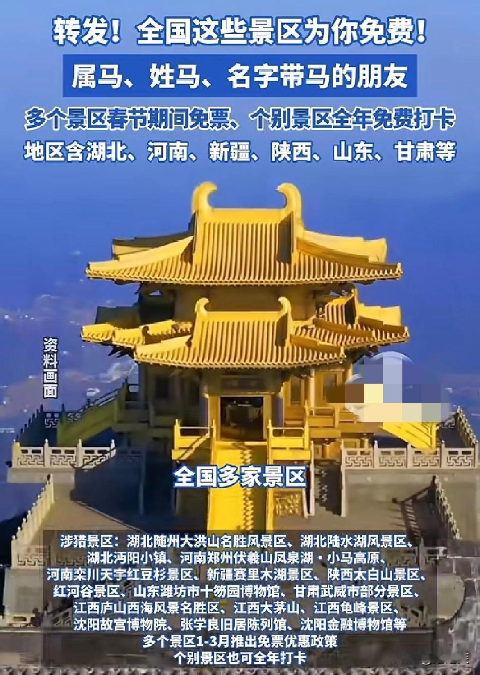 太香了 重磅福利 全国多家景区给属马、姓马、名字带马的朋友送免票福利啦 湖北、河南、新疆陕西等多地景区参与 部分景区春节期间免票,个别景区甚至全年免费打卡 涵盖随州大洪山、赛里木湖、沈阳故宫等知名景点 不过友情提示,各景区免票细则和适用时间不同,一定要提前查官方公告哦 你符合免票条件吗