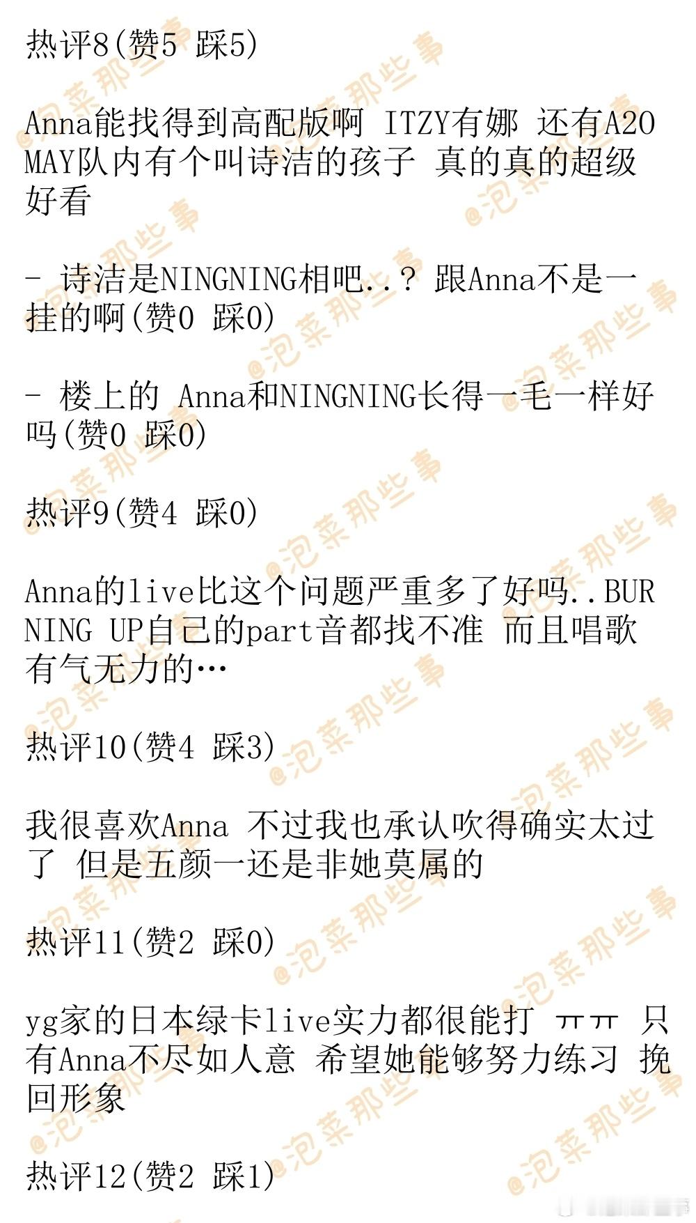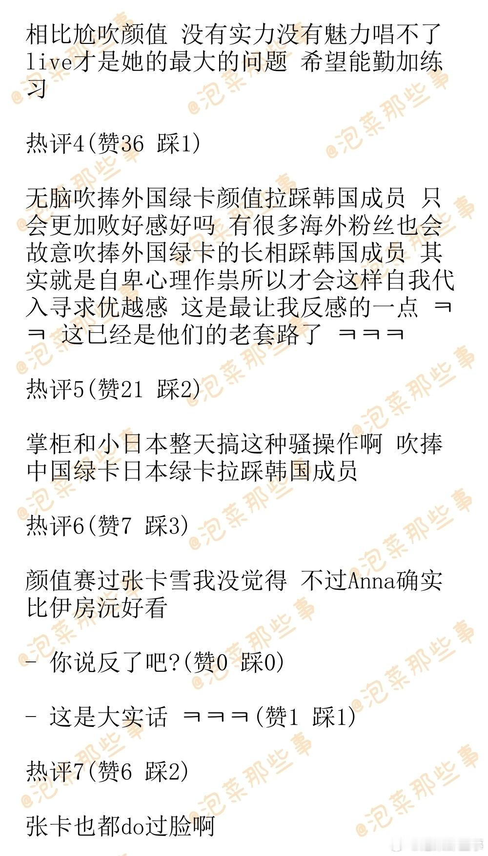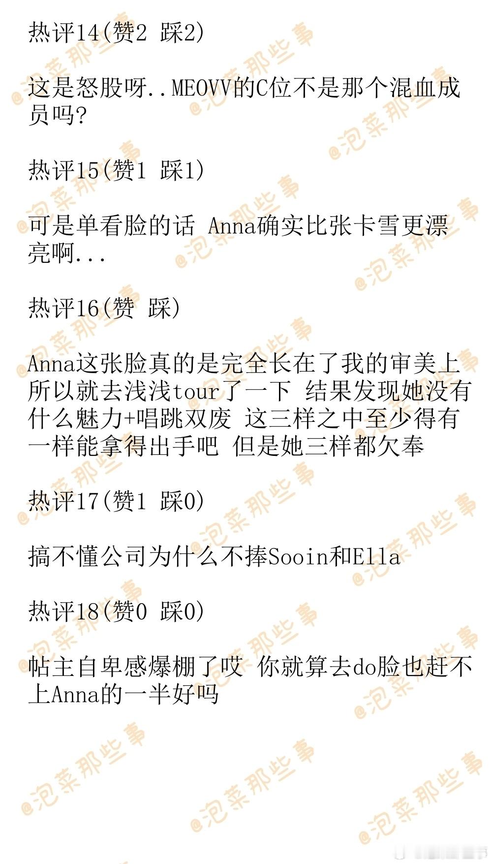 🔥韩网热帖评论翻译🔥MEOVV Anna粉丝发的评论真的是太气人了韩网原帖帖主称:什么历代女爱豆one top,建国以来头号美女, 颜值赛过张卡雪 等等等等 夸她漂亮不就行了嘛 吹得这么狠真的是太诡异了有没有 而且她虽然漂亮 但并不是天然美女 Karina和雪允我觉得营销力度已经够大的了 没想到Anna才是老大 再加上还有一帮日吹海外粉丝 在各大平台上疯狂刷屏尬吹 我也很喜欢Anna 但现在因为过度营销渐渐对她产生了反感cr.pann