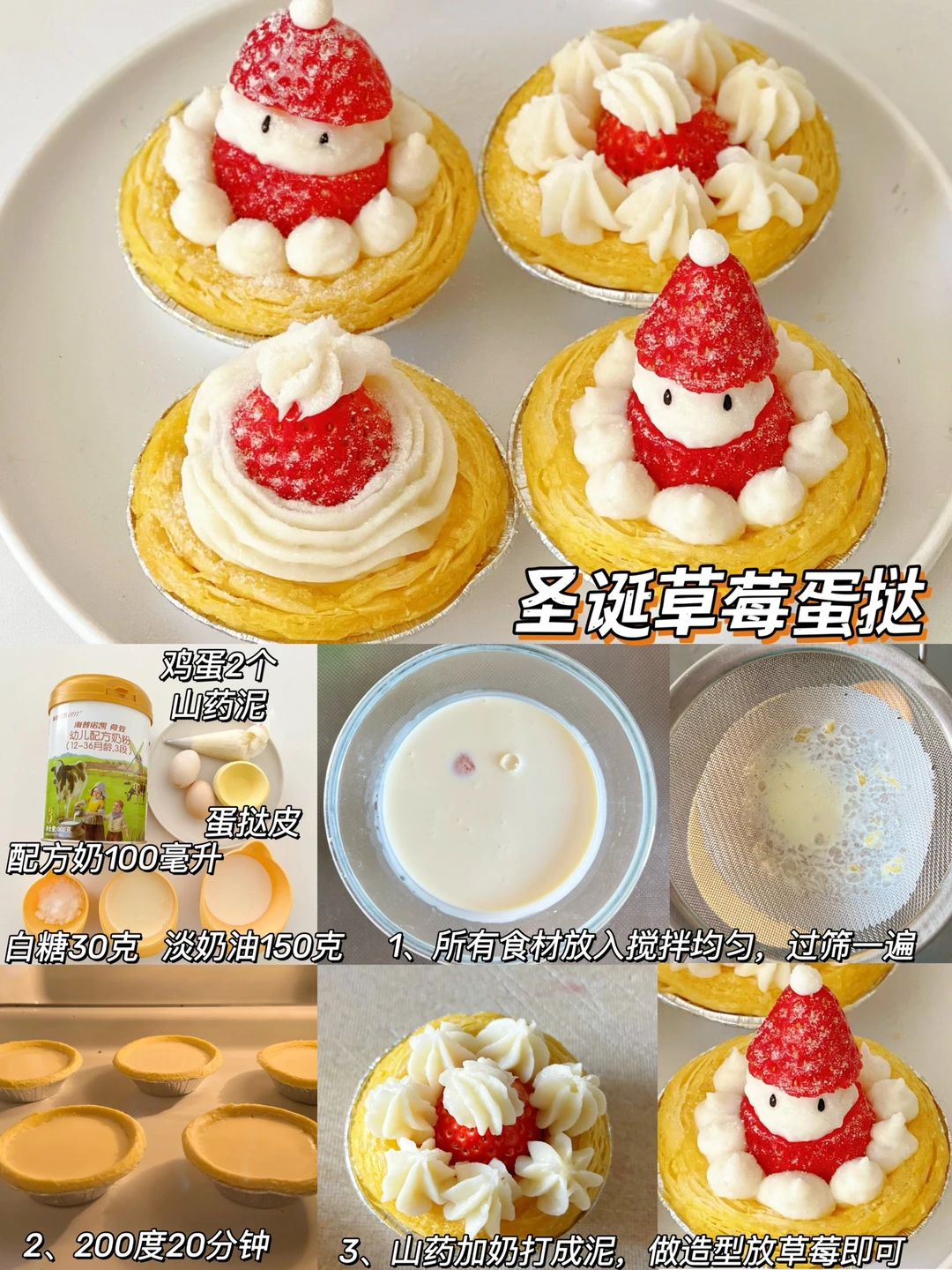 上面挤山药泥抹平,再挤一圈豆豆,黑芝麻酱画眼睛,草莓做鼻子,帽子,山药泥画出胡子圣诞老人 就做好啦