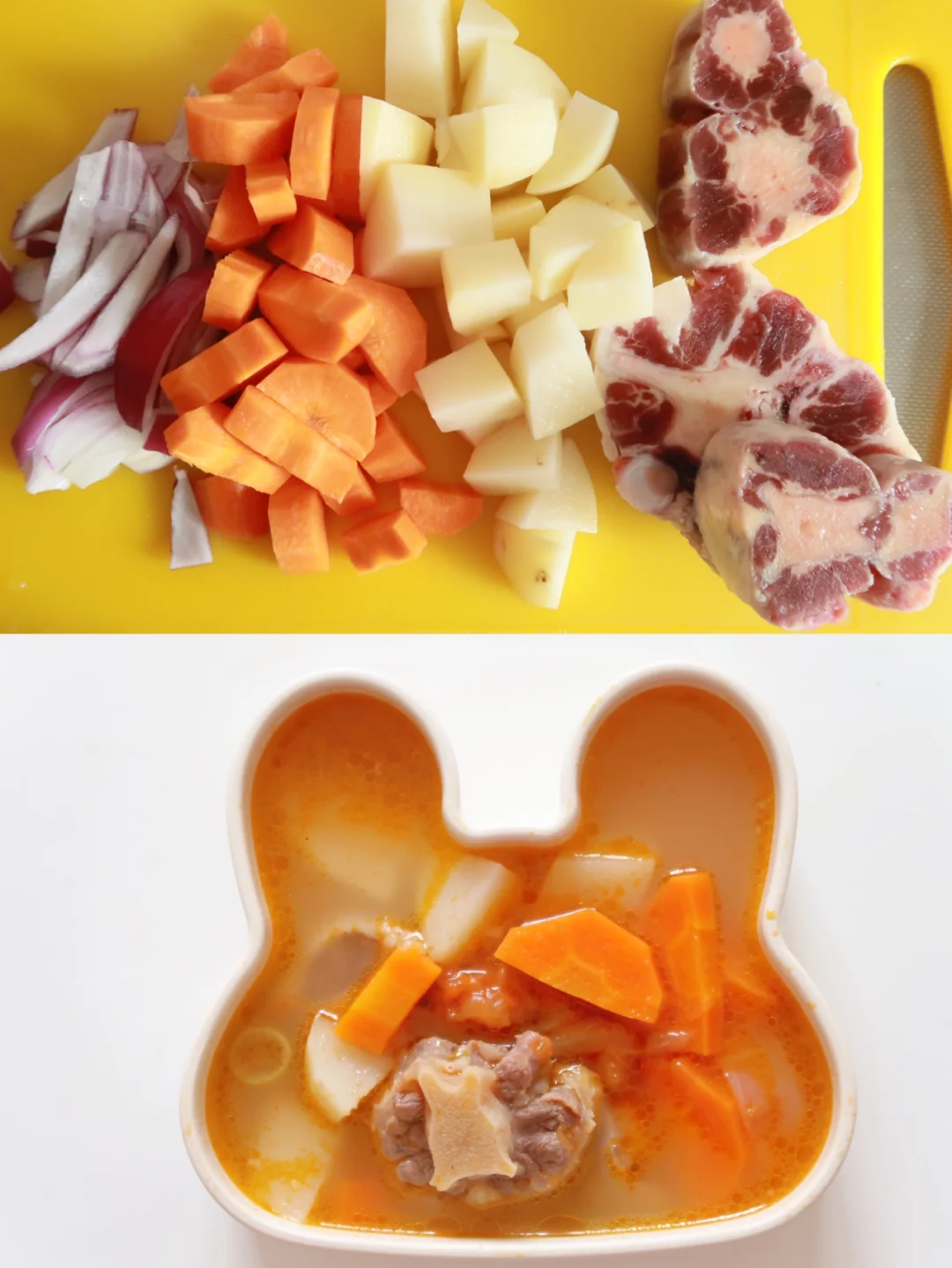 制作:牛尾骨葱姜去腥去血沫,番茄去皮切成碎爆炒出汁,加一勺番茄酱煮开,加入洋葱和葱段搅拌,加入温水煮开倒入牛尾骨中,将所有材料放入炖锅中炖一个小时后放入其他食材煮半小时即可