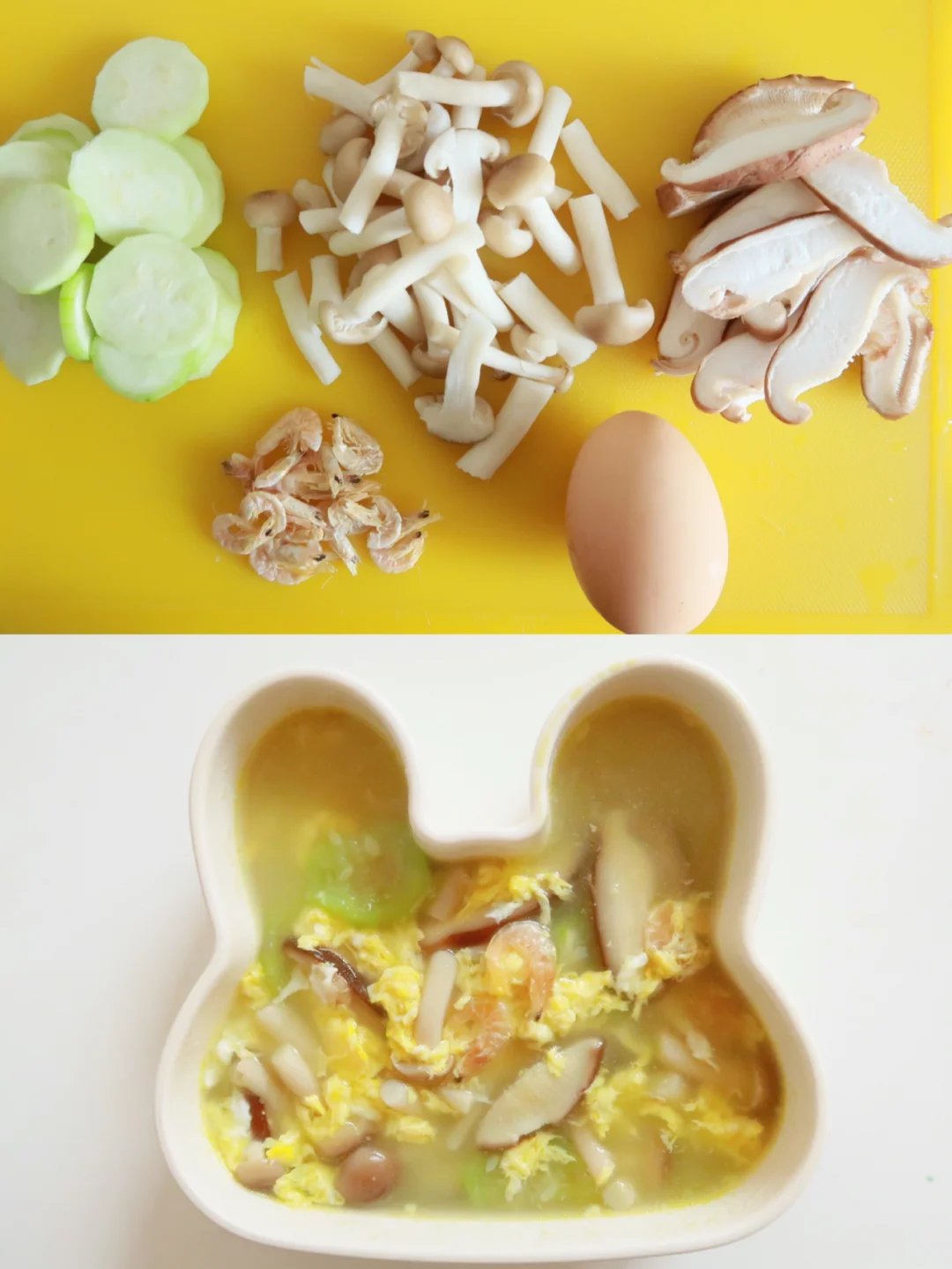 材料:丝瓜、菌菇、鸡蛋、虾皮