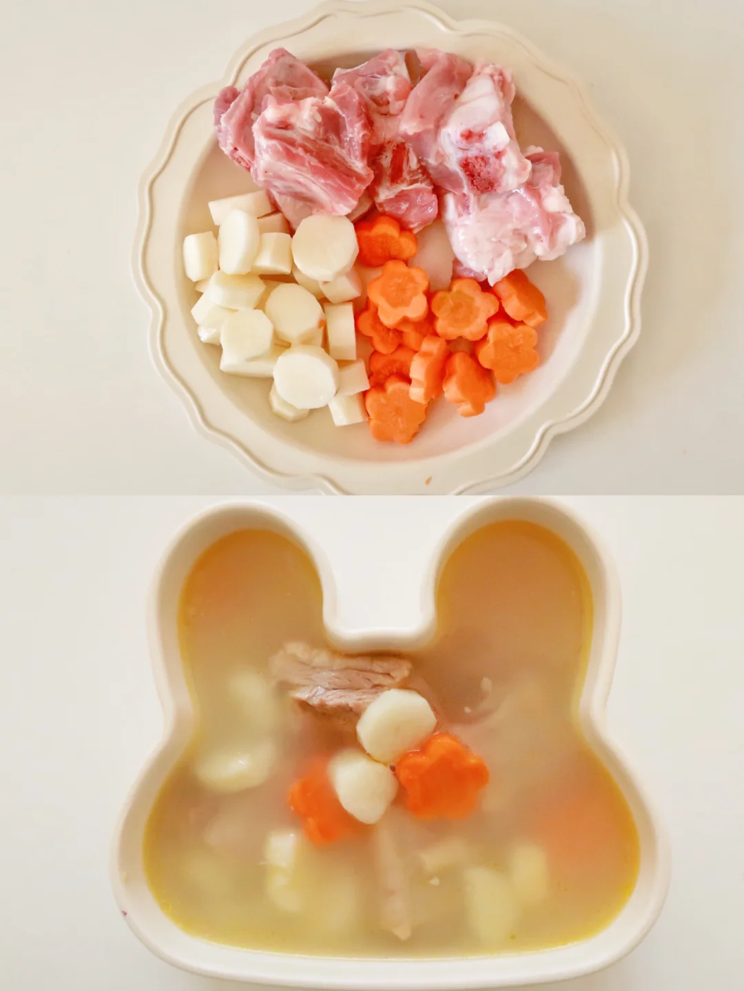 制作:排骨葱姜焯水去血沫后放入炖锅中,熬半小时后加入山药和胡萝卜半小时即可