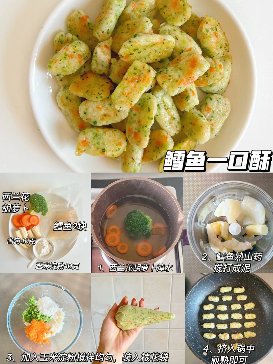 制作:鳕鱼姜片去腥,西兰花胡萝卜焯水切碎,山药蒸熟加入鳕鱼搅打成泥,所有食材混合加入玉米淀粉搅拌均匀,装入裱花袋中,挤入锅中煎熟即可