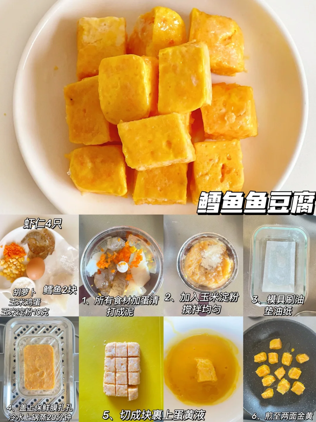 制作:鳕鱼姜片去腥,将所有食材加入蛋清搅打细腻,再加入玉米淀粉搅拌,碗中刷油垫上油纸,倒入鱼泥,盖上保鲜膜炸孔,冷水上锅蒸20分钟,切成块裹上蛋黄液,煎熟即可