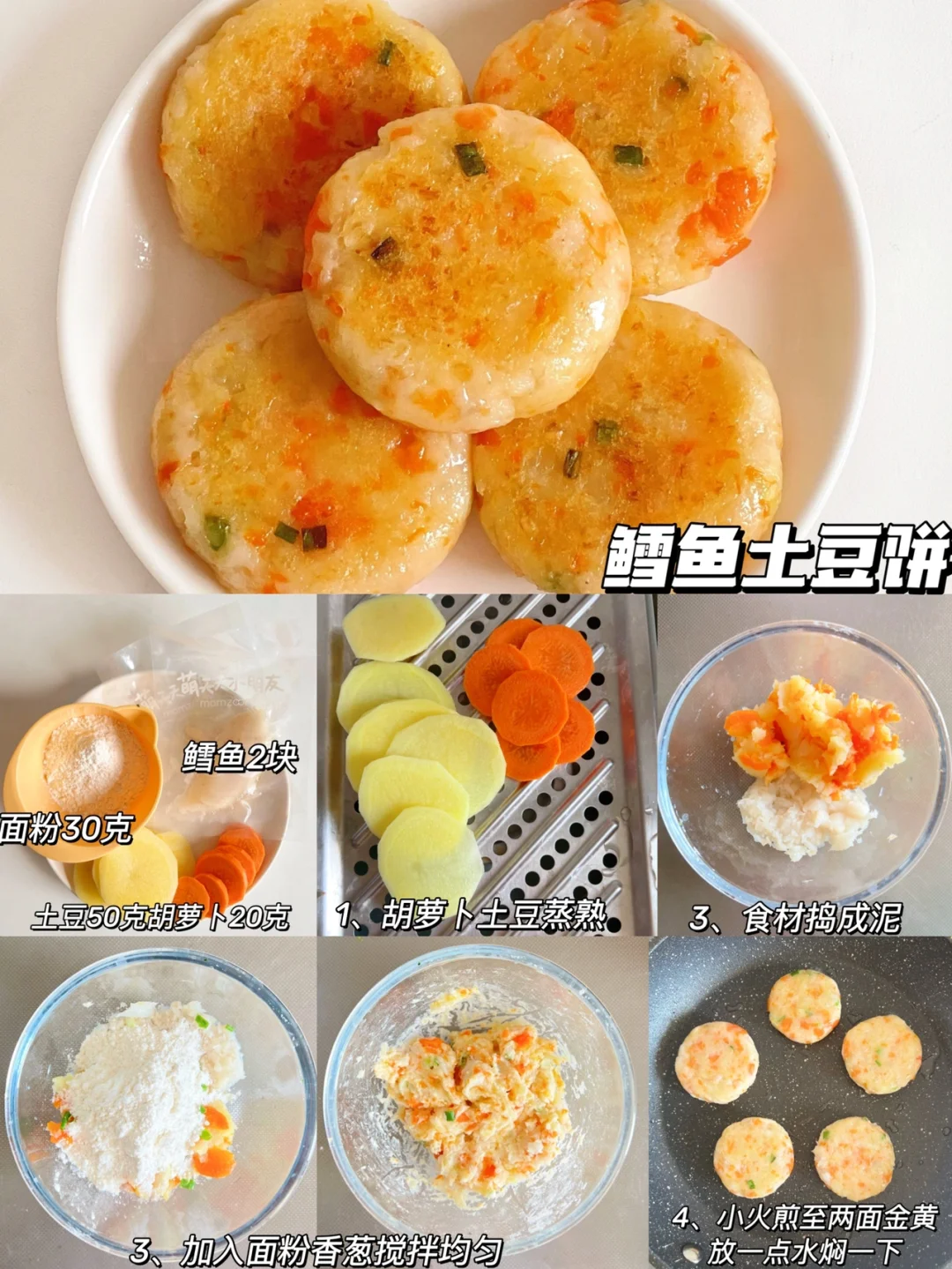 制作:鳕鱼姜片去腥切碎,胡萝卜土豆上锅蒸熟碾成泥,加入面粉香葱搅拌均匀,取适量整理成饼状,小火煎至两面金黄色,倒入一点水盖上盖子焖煮即可