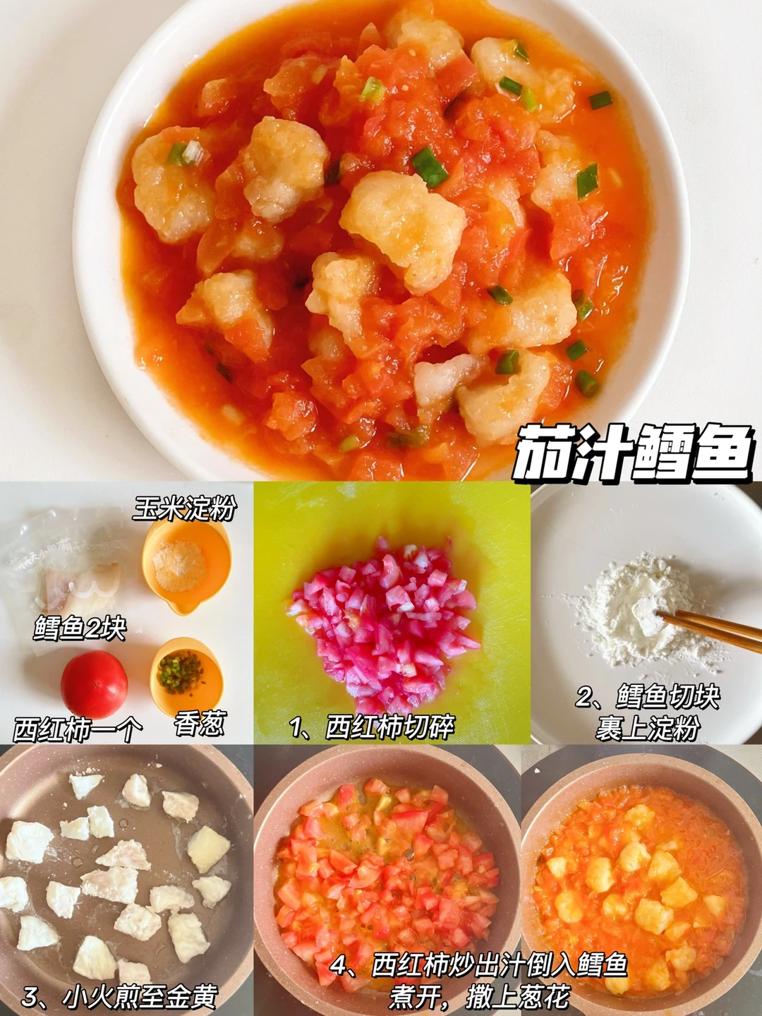 制作:鳕鱼姜片去腥,鳕鱼切块裹上玉米淀粉,小火煎制金黄色,西红柿去皮切碎翻炒出汁,放入鳕鱼块,煮熟后撒上葱花即可