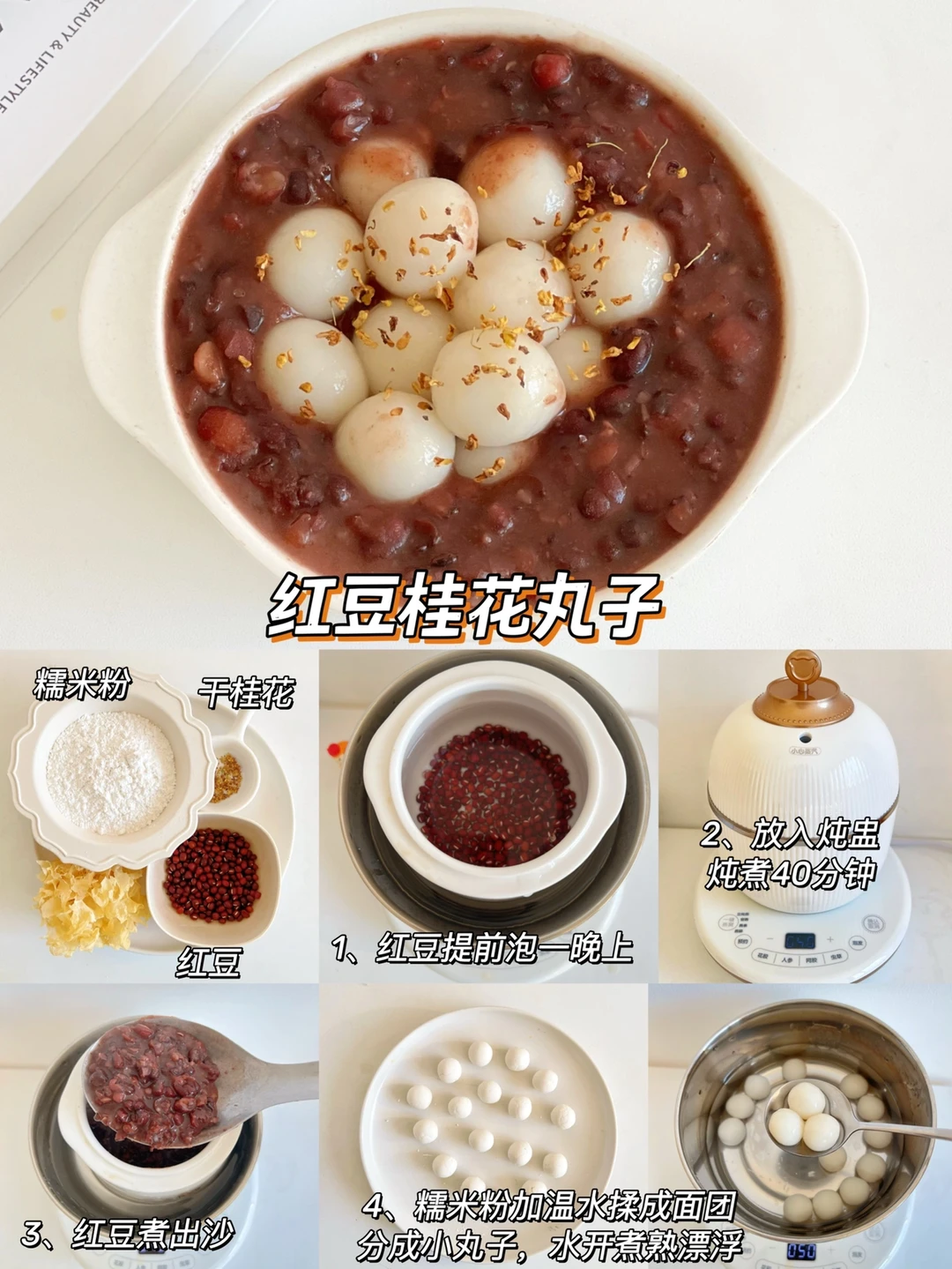 制作:红豆提前浸泡一晚放入燕窝炖盅煮出沙,糯米粉加水和成团搓成小丸子煮熟,放入红豆沙中,撒上干桂花即可