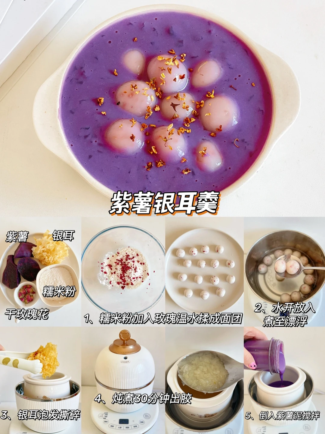食材:紫薯、糯米粉、玫瑰花干、银耳、牛奶