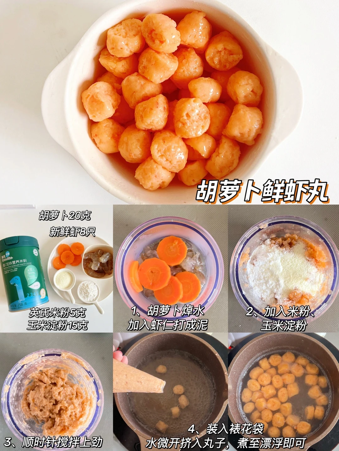虾100克、胡萝卜20克、玉米淀粉15克 、米粉5克