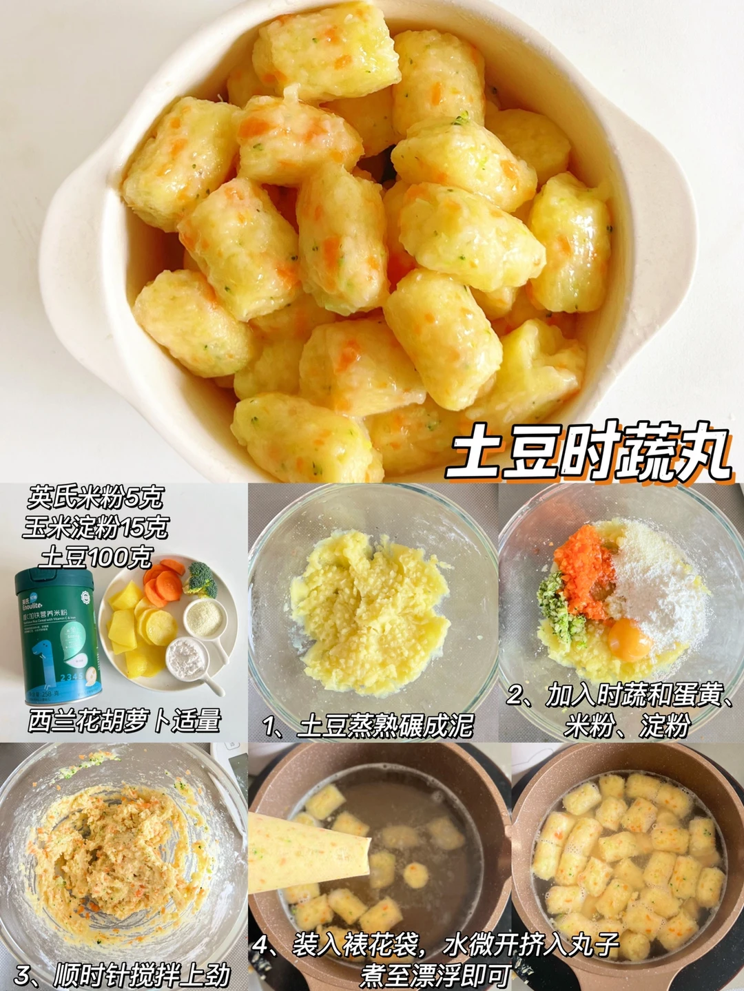 土豆100克、蛋黄一个、胡萝卜西兰花适量、玉米淀粉15克 、米粉5克