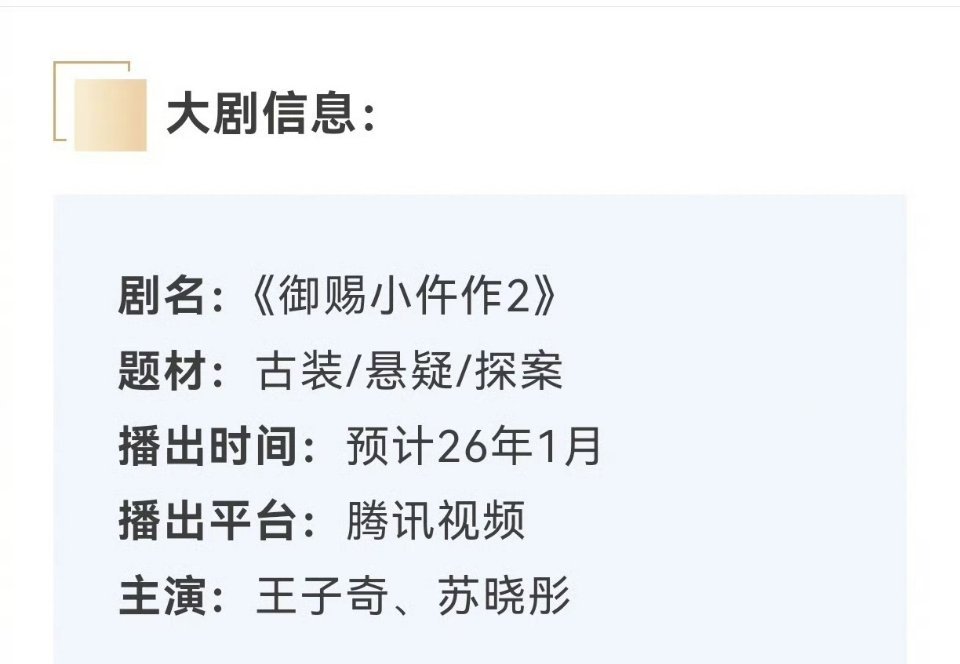 王子奇、苏晓彤《御赐小仵作2》预计1月14日腾讯视频开播,好期待