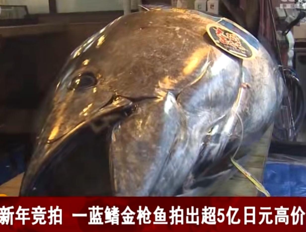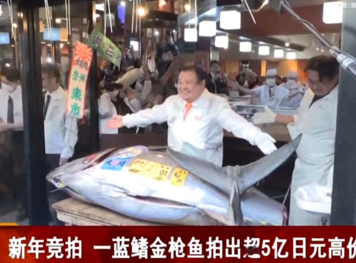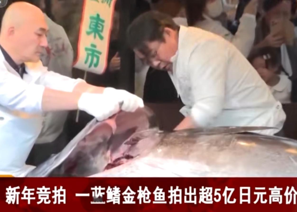 日本新年首场蓝鳍金枪鱼竞拍中,一条巨型蓝鳍金枪鱼拍出超5亿日元的天价。现场可见这条金枪鱼体型硕大,鱼身贴有竞拍标识,摊主兴奋地展开双臂展示,随后工作人员对其进行分割处理,周围挤满围观和拍摄的人群。这场竞拍是日本水产市场的新年传统,天价成交也让这一食材的稀缺与珍贵再次引发关注。
