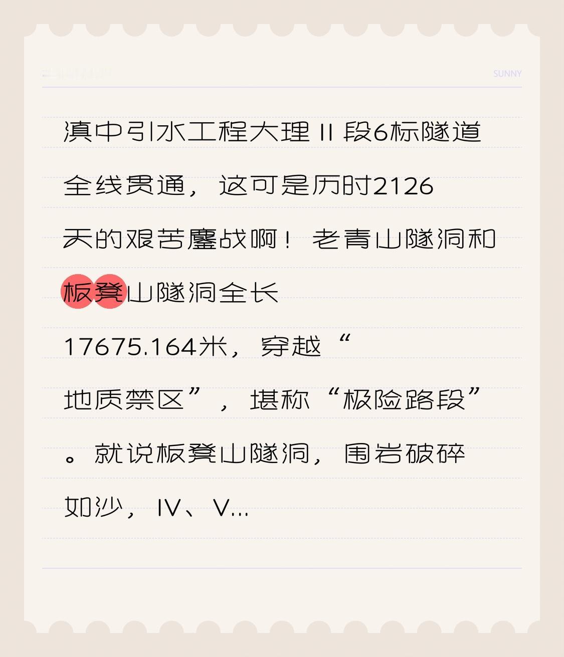 喜讯!滇中引水工程大理Ⅱ段6标隧道全线贯通 滇中引水工程大理Ⅱ段6标隧道全线贯通,这2126天的鏖战太不容易了!老青山隧洞和板凳山隧洞全长17675.164米,穿越“地质禁区”,堪称“极险路段”。 板凳山隧洞围岩破碎如沙,IV、V类围岩占比达100%,还累计塌方13次;单日最大涌水量达49000立方米,相当于12个“水立方”泳池;还得面对毒气与变形双重夹击。 不过建设者超牛,[给力][加一]用科技创新破局。动态治水、毫米级贯通、智慧管理,最终贯通精度优于设计标准50%以上。这不仅是工程的胜利,更是建设者智慧与毅力的见证!