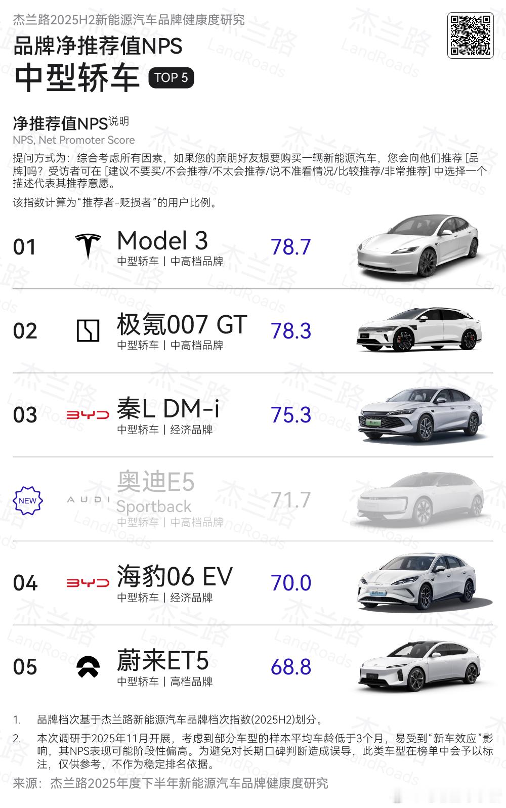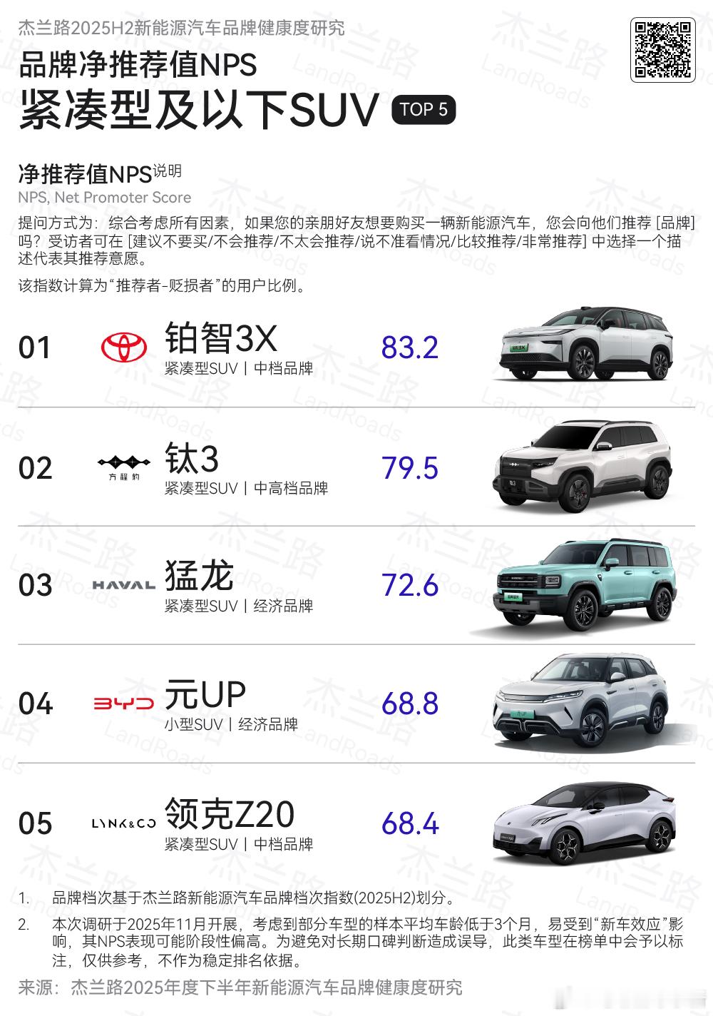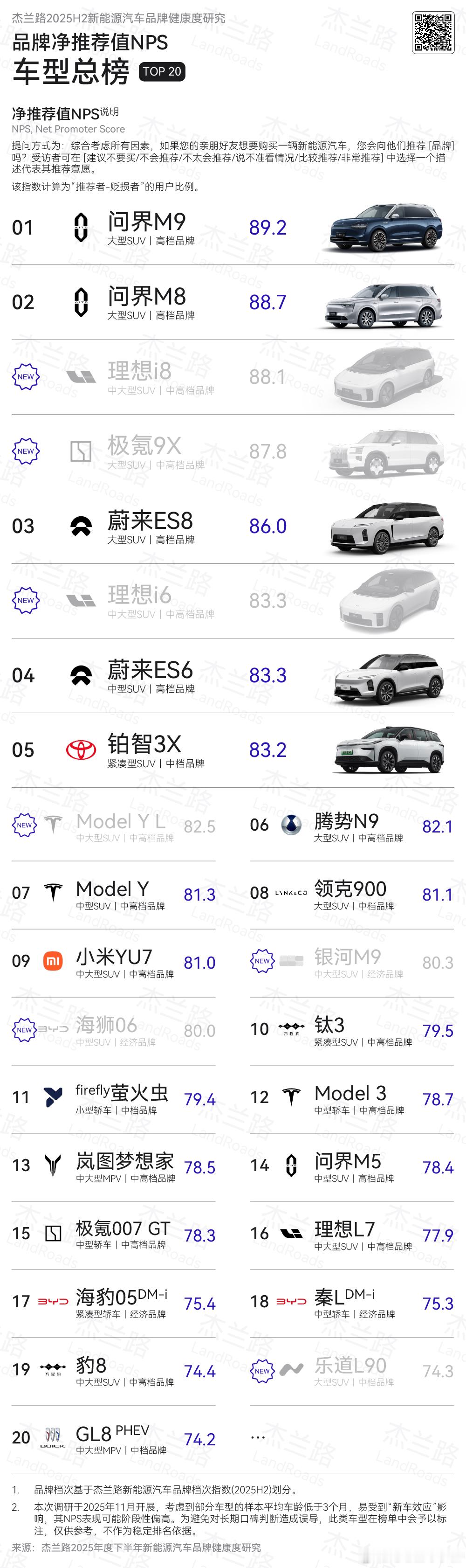 杰兰路发布 2025 年下半年新能源汽车品牌健康度研究 ( NPS 篇)- 品牌净推荐值(NPS)前五是:问界(82.5)、特斯拉(80.6)、firefly萤火虫(79.4)、蔚来(74.9)、理想(74.7)杰兰路对于这五个品牌的概括就是:- 问界:高端车型驱动 NPS 领跑,品牌推荐基础同步夯实。- 特斯拉:NPS 长期高位稳定,“少而强”的车型结构持续支撑口碑。- firefly 萤火虫:小众定位下的综合认可型 NPS 案例。- 蔚来:全新 ES8 修复信心,服务与品牌档次仍为核心支撑。- 理想:NPS 进入稳定期,单一增程优势弱化,纯电成为新支点。- 车型净推荐值(NPS)前五是(总榜):问界M9(89.2)、问界M8(88.7)、蔚来ES8(86)、蔚来ES6(83.3)、铂智3X(83.2)可以看到榜单前列都以中大型 SUV 为主(图3),且高端及中高端定位车型占据明显优势。- 推荐理由:产品体验仍是用户推荐的首要原因,但用户口碑的重要性持续上升,已经连续三期成为第二大推荐理由。销量表现作为推荐理由的重要性持续下滑。杰兰路新能源汽车