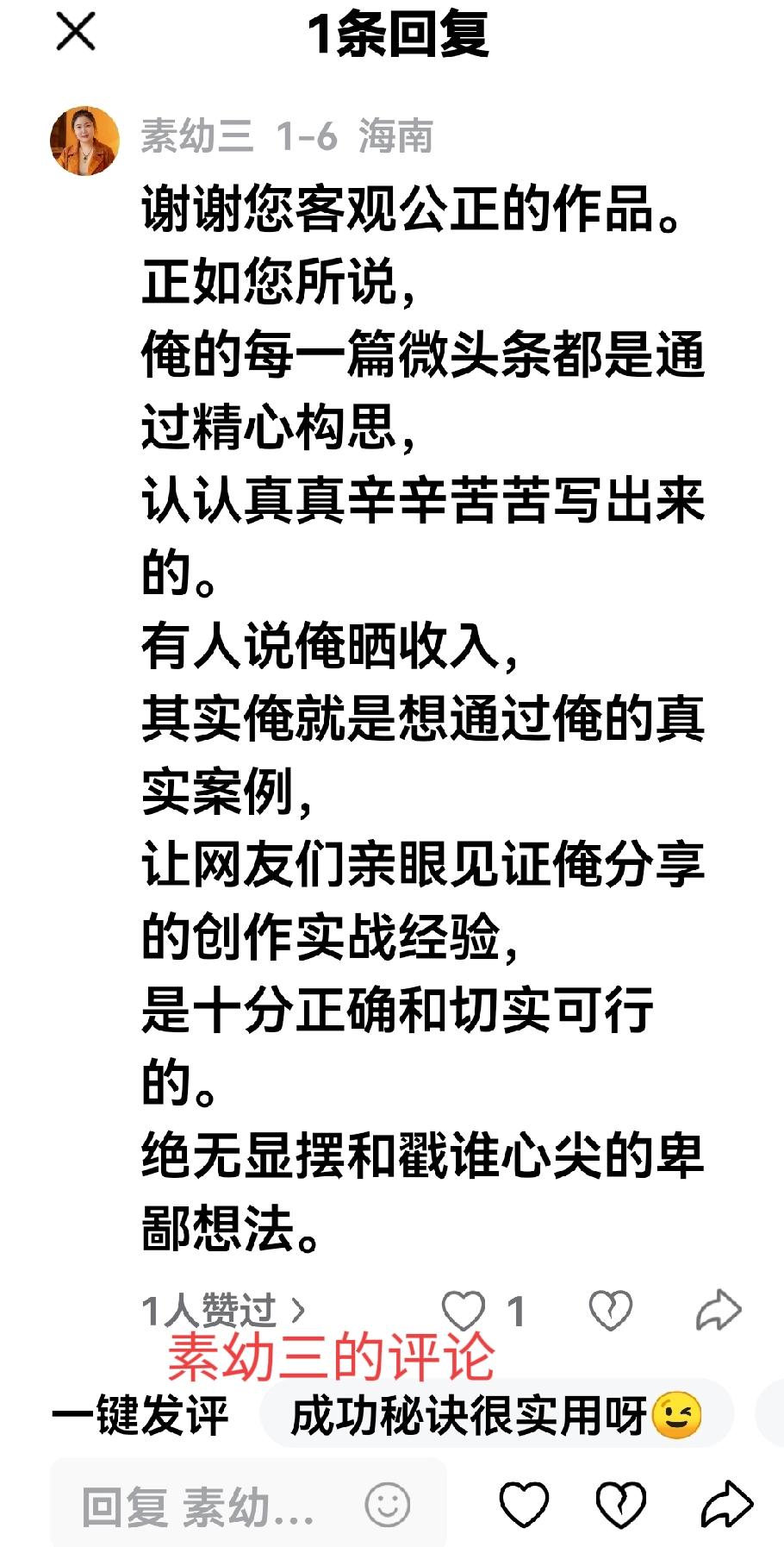 素幼三说她的收益单价都超过11元了,我倒是认为这是她正当劳动所得。 素幼三成功的秘诀其实就五个字“不弄虚作假”,如果你做到了,你也会成功! 昨日在一篇微文中提到了素幼三,说她是头条创作者新秀,她立马就关注到了那篇微文,并留了言,她在评论区的留言是真诚的,看不出一点敷衍(后面有附图),仅仅一条评论、就差不多二百来字,差不多就是一篇微文了,而且评论的内容与微文的内容相符,这就说明素幼三不仅对原文进行了认真的阅读,而且还写下了真实所感,她所花费的时间也应该不在十分钟之下了,不像有的创作者来互动,像征性的简单评论一下、支持、点赞之类,可能根本就没有阅读原文,互动也可能就是一秒滑过而已! 素幼三说的成功8字秘诀中就有“互动”两字,从素幼三在我的微文中互动的情节来看,她的互动是真诚的,是真心投入的,看不出一点投机取巧、可能正是这一点感动了头条、头条的大数据都是有记录的,这也为素幼三的账号加了分,被头条记录为勤劳账户,所以头条给她高收益单价也是她正当劳动所得! 素幼三的成功不是偶然的,她就像一个勤劳的工人,长期真诚的输出,被老板“捕获”到,这就是一位优秀员工,老板自然就会看重她了。 友友们!素幼三的真诚与勤奋你真的做到了吗?做到了,下一个成功的就是你!