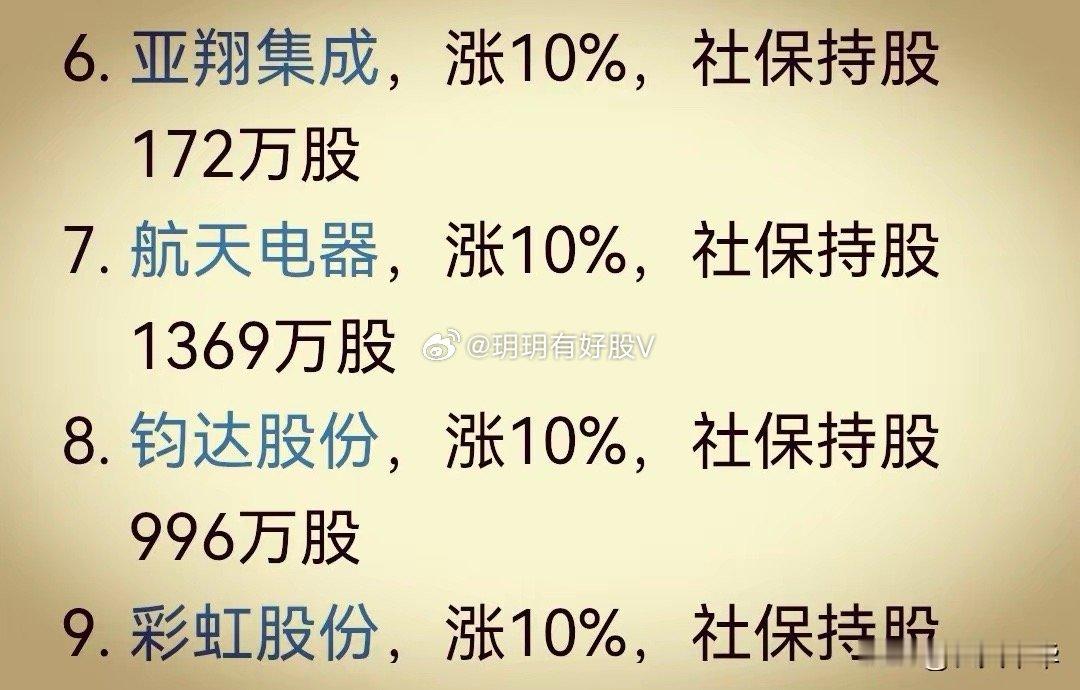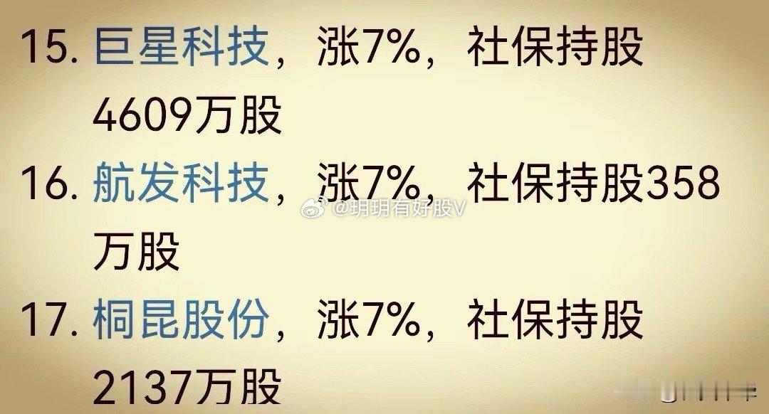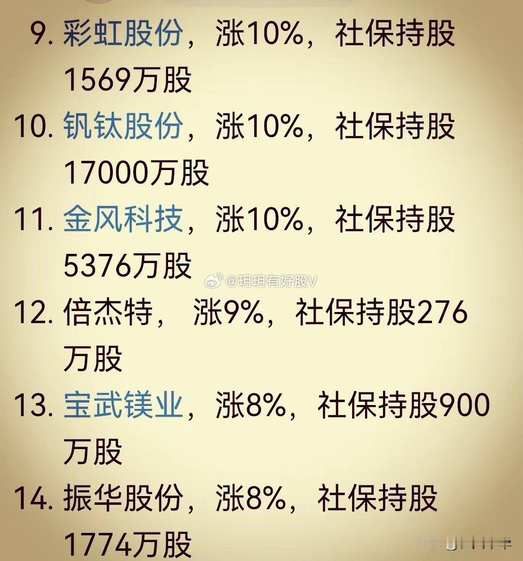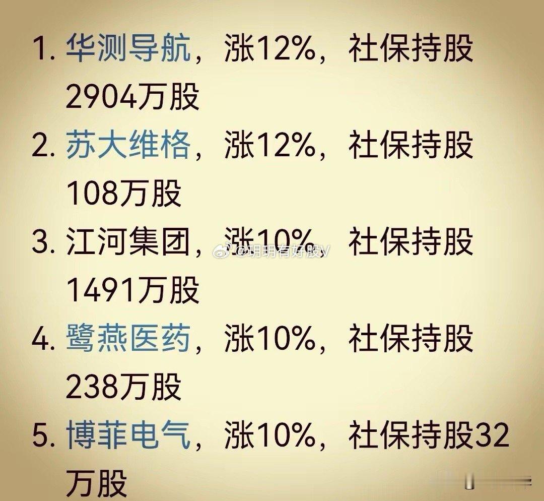 社保基金重仓股出现大面积涨停。像社保基金重仓2904万股的华测导航今天涨幅12%。社保基金重仓108万股的苏大维格今天涨幅12%。社保基金重仓1491万股的江河集团今天涨停板。社保基金重仓238万股的鹭燕医药今天涨停板。社保基金重仓32万股的博菲电气今日涨幅10%。今天社保重仓股涨停的还有亚翔集成、航天电器、钧达股份、彩虹股份、钒钛股份、金风科技等。太疯狂了。