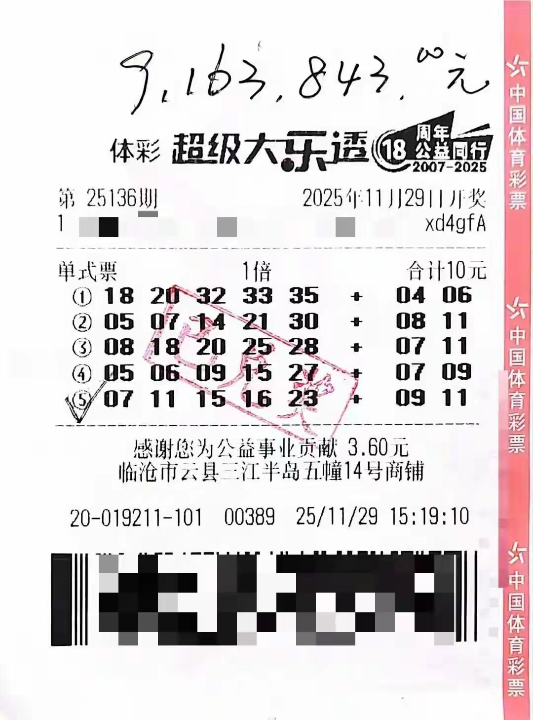 900万大奖躺钱包1个月!沾这份好运,新年顺风顺水顺财神! 云南临沧李先生这运气也太绝了——花10块钱机选的彩票,在钱包里“躺平”一个多月,居然藏着900万大乐透一等奖!直到2025年最后一天,他才意外发现这个天大惊喜,真·年末最强锦鲤本鲤! 说起来这好运也太随性了:李先生买彩票从不多花冤枉钱,每次就10块钱买5注,号码机选了一年多,买完就扔钱包,压根没当回事。要知道彩票兑奖就60天,体彩中心都发了好几次“寻人启事”,再晚几天这900万就要成公益金了,还好最后赶上了末班车! 李先生的心态也太好了,中了大奖还保持冷静,说会继续工作,只想给家人改善生活、帮需要的人。这种理性购彩、不贪不躁的样子,难怪好运会找上门! 新的一年刚开始,就刷到这么喜气的事,必须来沾沾福气! 愿大家都能接住这份好运,顺风顺水顺财神,事事顺心没烦恼,日子过得美美滋滋! 也别忘了理性购彩,好运可能会迟到,但不会缺席,新年快乐呀! (信息来源:光明网)