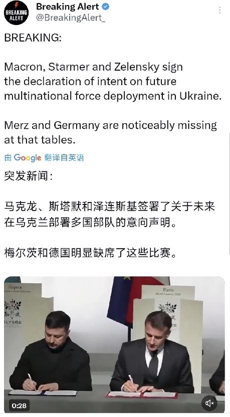 突发新闻:法国总统马克龙、英国首相斯塔默和乌克兰总统泽连斯基今天(北京时间1月7日)签署了关于未来在乌克兰部署多国部队的意向声明。 很多人看到这则新闻第一反应会懵,这支部队到底要什么时候派、派去做什么?先把核心前提说清楚,这份意向声明里的多国部队部署,并不是要立刻派往俄乌冲突前线。根据三国公开表态和后续披露的细节,这支部队的部署有个关键前提——俄乌必须先达成和平协议。 马克龙在签署声明后明确,这支部队不会部署在俄乌接触线沿线,核心任务是协助乌克兰重建武装力量,同时保障乌克兰的天空和海洋安全。 斯塔默也补充,这份声明将为后续建立法律框架铺路,停火后英法还计划在乌克兰境内建立军事枢纽,用于部队部署和武器装备存放。 大家可能会好奇,英法为什么要在这个节点牵头推进这件事?背后其实是欧洲在俄乌冲突中的话语权焦虑。近期俄乌和平谈判出现转机,美国在其中的协调作用愈发突出,欧洲国家担心战后乌克兰的安全架构安排会被美俄主导,自己沦为旁观者。英法作为欧洲老牌军事强国,急于通过这种方式抢占主导权,彰显欧洲在区域安全事务中的自主地位。 乌克兰方面的诉求更直接,泽连斯基一直希望获得西方长期安全保障。他在社交平台发文确认,已经和英法就部队规模、武器类型等具体细节完成磋商,也和美国就停火监督机制开展了具体讨论。对泽连斯基来说,多国部队的入驻承诺,既能在谈判桌上给俄罗斯施压,也能为乌克兰战后安全增加一层“保险”。 但这件事远没表面看起来那么简单,后续落地的变数极大。首先是欧洲内部的分歧问题,这次签署声明的只有英法乌三国,所谓的“多国部队”其实是“志愿联盟”框架下的产物。 此前多次相关会议中,德国、意大利等国态度一直谨慎,甚至明确表达过反对,担心军事介入会刺激俄罗斯,还可能超出本国防务能力和国内政治共识。 美国的态度也很关键。这次巴黎会议上,美国派出了特朗普的特使威特科夫和女婿库什纳参会,美方愿意参与停火监督并提供情报支持,但始终没有承诺派遣地面部队。 欧洲国家其实心里没底,没有美国的军事托底,很多国家不敢轻易派兵,毕竟一旦局势失控,风险要由欧洲自己承担。 最大的阻力还是来自俄罗斯。俄罗斯外长拉夫罗夫此前就多次警告,任何形式的西方军队出现在乌克兰领土上,都会被视为对俄罗斯的直接威胁,将成为俄军的“合法目标”。 目前俄罗斯方面没有任何迹象表明愿意接受这类安排,领土问题仍是谈判的核心障碍,俄军在战场上的行动也没有减弱。 更值得注意的是,这份意向声明目前还不具备法律约束力。波兰总理图斯克就直言,这类声明目前“不构成任何承诺”,只是确认各方的共同意愿。后续要真正落地,还需要各国议会批准,这个过程本身就充满不确定性。 总结来看,英法乌这次签署声明,更多是一种政治姿态和谈判筹码。它想向俄罗斯传递强硬信号,推动俄乌和谈朝着对己方有利的方向发展,但实际落地需要跨越欧洲内部分歧、美国态度摇摆、俄罗斯强烈反对等多重障碍。 后续局势会如何演变?大概率是先停留在纸面阶段,各方继续围绕细节博弈。如果俄乌和谈能取得突破,这支部队可能会以小规模、象征性的形式在乌克兰西部非前线区域部署;如果谈判陷入僵局,这份声明很可能就沦为“一纸空文”。无论如何,这件事都让俄乌冲突的外溢风险进一步上升,后续进展值得持续关注。