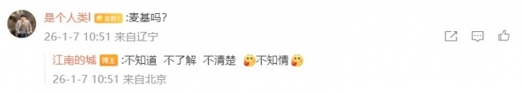 一名网友问出了麦基的名字,@江南的城回复:“不知道不了解不清楚不知情”