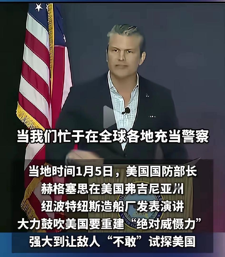 当地时间1月5日,美国战争部长赫格塞思在纽波特纽斯造船厂高调宣称,要重建“绝对且不容置疑的威慑力”,还以打击胡塞武装、轰炸伊朗核设施等霸凌行径为证,高呼“威慑力回来了”。 这番“满满的自信”,实则是其对霸权的焦虑。他抱怨中国海军“批量下水”,却不提2025年中国服役11艘盾舰,美国则无新驱护舰入列的现实。正如有关专家所言,美国霸权已不再伪装,直白将绝对军事优势当底气,而这背后正是军工复合体的利益捆绑。靠欺凌弱小“杀鸡儆猴”的威慑,不过是外强中干的霸权挽歌。