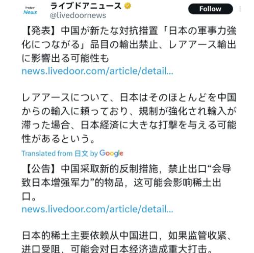没想到日本反应情绪如此之大!在我们严格管控军民两用物资对日本进行反制之后,日本国内情绪非常激动。有日本网友就说,这样的管制措施比当年欧洲对付中国的瓦森纳协议管制还要严格。中国对日本禁运的军民两用商品,目录就列了一百多页。 有人就表示,中国这是正式宣告,要么高市早苗收回她关于台湾的讲话,要么高市下台,中日关系没可能改善。 很多人盯着日本网友喊“管制比瓦森纳协议还严”的情绪宣泄,却没看清一个关键:日本这次的集体焦虑,本质是高市早苗的政治冒险,撞上了日本产业结构的致命软肋。中国这一百多页的管制清单,看似是对涉台言论的反制,实则精准戳中了日本“寓军于民”模式的命门。 高市早苗当初抛出“台湾有事可能构成日本存亡危机事态”的言论,绝非一时口误。熟悉日本政坛的人都清楚,当前日本自民党内右翼势力抬头,温和派持续边缘化,“对华示强”已成部分政客博取支持的政治正确。 高市早苗这番表态,本质是想借涉台议题绑定右翼势力、稳固执政根基,可她明显算错了两步:一是低估了中国捍卫核心利益的决心,二是没摸清日本产业对中国的依赖程度有多深。 日本网友拿瓦森纳协议对比,其实暴露了他们的认知偏差。瓦森纳协议是欧美为维持技术霸权搞的霸权主义管制,而中国这次的措施,完全是基于自身法律和国际义务的精准反制。而且,两者的影响逻辑完全不同:瓦森纳协议针对的是中国整体技术发展,而中国的管制直接瞄准日本军工的“粮草供应链”。 日本军工体系长期依赖三菱、川崎重工等企业的民用技术转化,这些企业生产导弹导引头、战斗机发动机所需的中重稀土、特种半导体材料,恰恰高度依赖中国出口。 日本外务省急着抗议“不符合国际惯例”,这番话纯属双标。日本作为瓦森纳协议成员国,常年跟着欧美搞两用物项管制,从没觉得有问题。现在轮到自己被管制,就急着跳脚,核心原因是管制已经引发了日本国内的连锁反应。 高市早苗的支持率本来就靠右翼撑着,现在管制措施让日本汽车、电子等核心产业感受到了实质痛感,经济界对高市政府的不满正在快速累积,这才是日本情绪失控的核心原因。 有数据能直观说明这种痛感有多强烈。日本的电动汽车电机、精密仪器等产业,对铽、镝等中重稀土的依赖度几乎达到100%,而这些资源的主要供应方就是中国。 日本多年来推动的供应链多元化根本没落地,技术壁垒和成本问题让企业无法快速找到替代来源。野村研究所的测算显示,要是稀土相关出口限制持续三个月,日本经济将损失6600亿日元,GDP会下降0.11%。 如果持续一年的话,损失会飙升到2.6万亿日元,GDP下降0.43%。这种实打实的经济压力,已经让日本经济界开始公开质疑高市早苗的对华政策。 所以“要么高市收回讲话,要么高市下台”的声音,本质是日本国内利益博弈的体现。经济界要的是稳定的经贸环境,而高市早苗的政治冒险正在毁掉这一切。中国的管制措施其实划清了明确边界:不针对日本普通民众,不影响合法民用贸易,只盯着军事相关用途。 这就把选择权直接交给了日方:是继续跟着高市早苗的错误言论走,让产业持续承压;还是纠正错误,保住中日经贸的基本盘。 还要看清一个关键背景,高市早苗当初敢说那些话,本来指望美国撑腰,结果却被盟友“泼了冷水”。中美元首通话时,美方明确表态理解台湾问题对中国的重要性,随后特朗普还专门致电高市早苗,要求她不要在台海问题上激怒中方。 这种情况下,高市早苗陷入了内外交困的境地:国际上没得到盟友的明确支持,国内又因产业承压引发不满。 现在的中日关系僵局,完全是高市早苗的政治误判造成的,要打破僵局,日方唯一的出路就是正视错误,要么让高市收回涉台谬论,要么让她承担相应政治责任,除此之外,别无他法。
