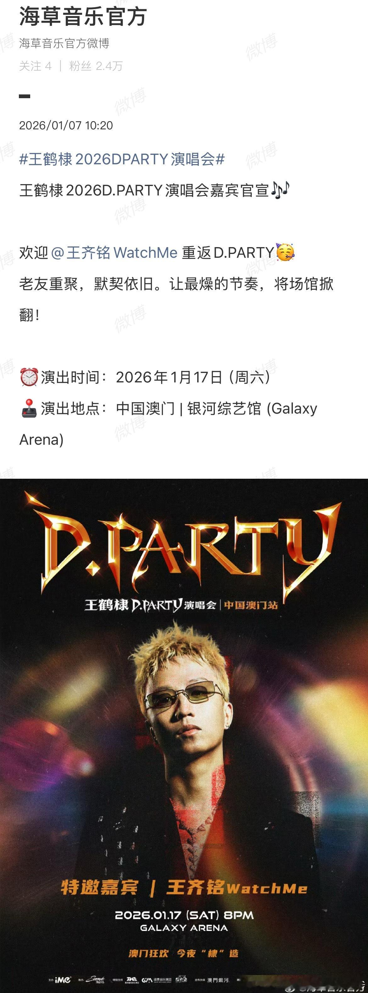王鹤棣演唱会官宣嘉宾:赵露思 GAI 魏奇奇 王齐铭 朴鲨……