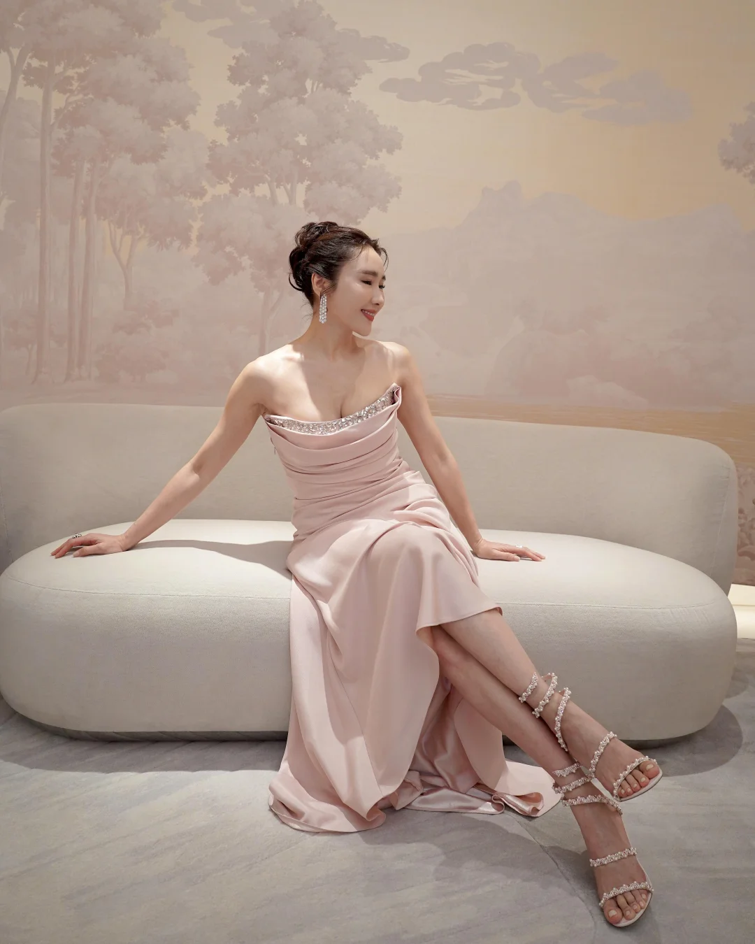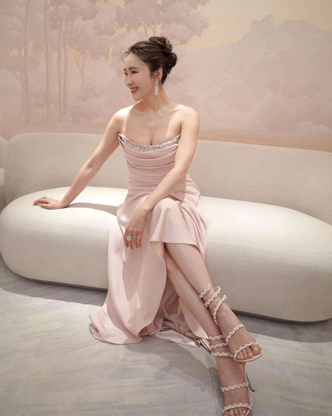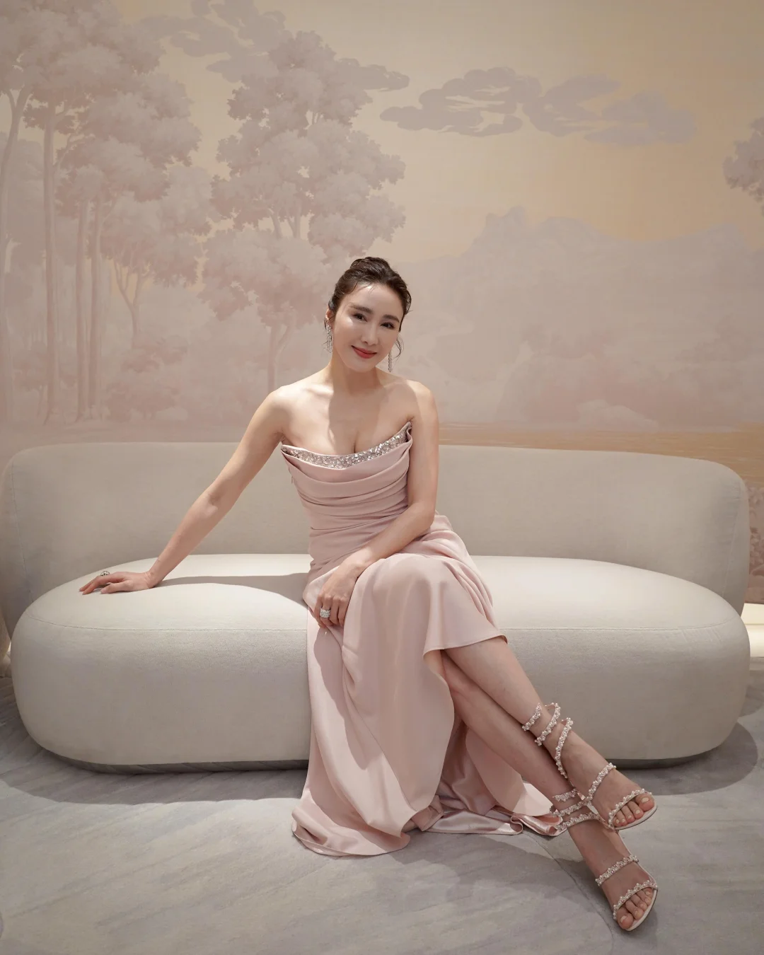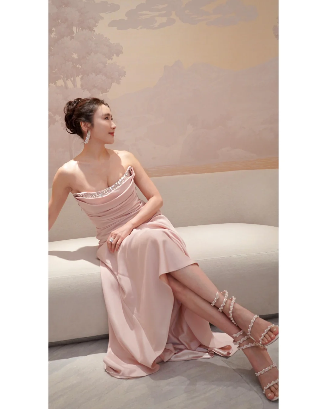 黎姿新年释出的这组粉色造型直接美到心巴上💕 一袭裸粉缎面抹胸长裙,垂坠感拉满的面料勾勒出优雅线条,胸口的水钻点缀又添了几分精致,搭配水钻高跟鞋,从头到脚的贵气感藏都藏不住~ 不得不说黎姿的审美真的在线,粉色很容易穿得甜腻,但她却穿出了大气与高级,温柔又有气场,而且这状态也很不错,气质温婉,岁月好像只给她添了韵味,真好~