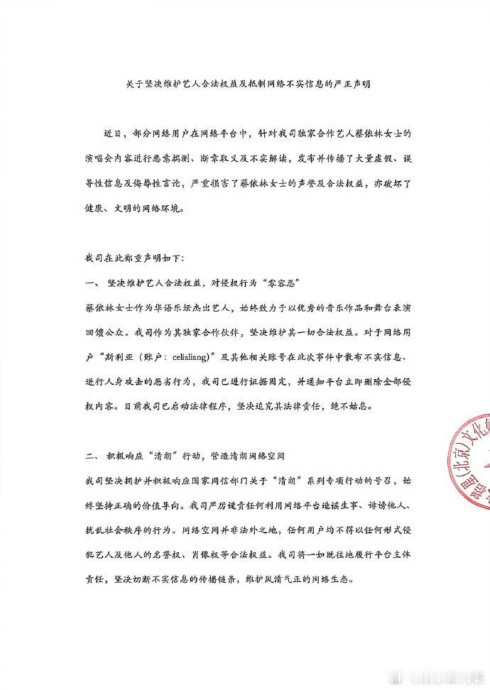 蔡依林方告黑蔡依林方发声明 发布告黑声明,针对部分网络用户散布不实信息、进行人身攻击的行为,已经进行了证据固定,将追究其法律责任。