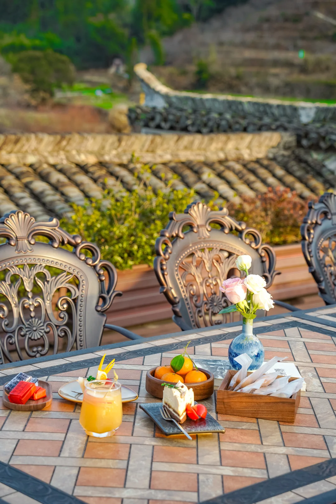 不想外出时,我最爱待在民宿的三楼露台。点一份下午茶,视野开阔无敌,整个西递古村的秋日美景——层层叠叠的马头墙、金黄的稻田尽收眼底,这份惬意独此一家。
